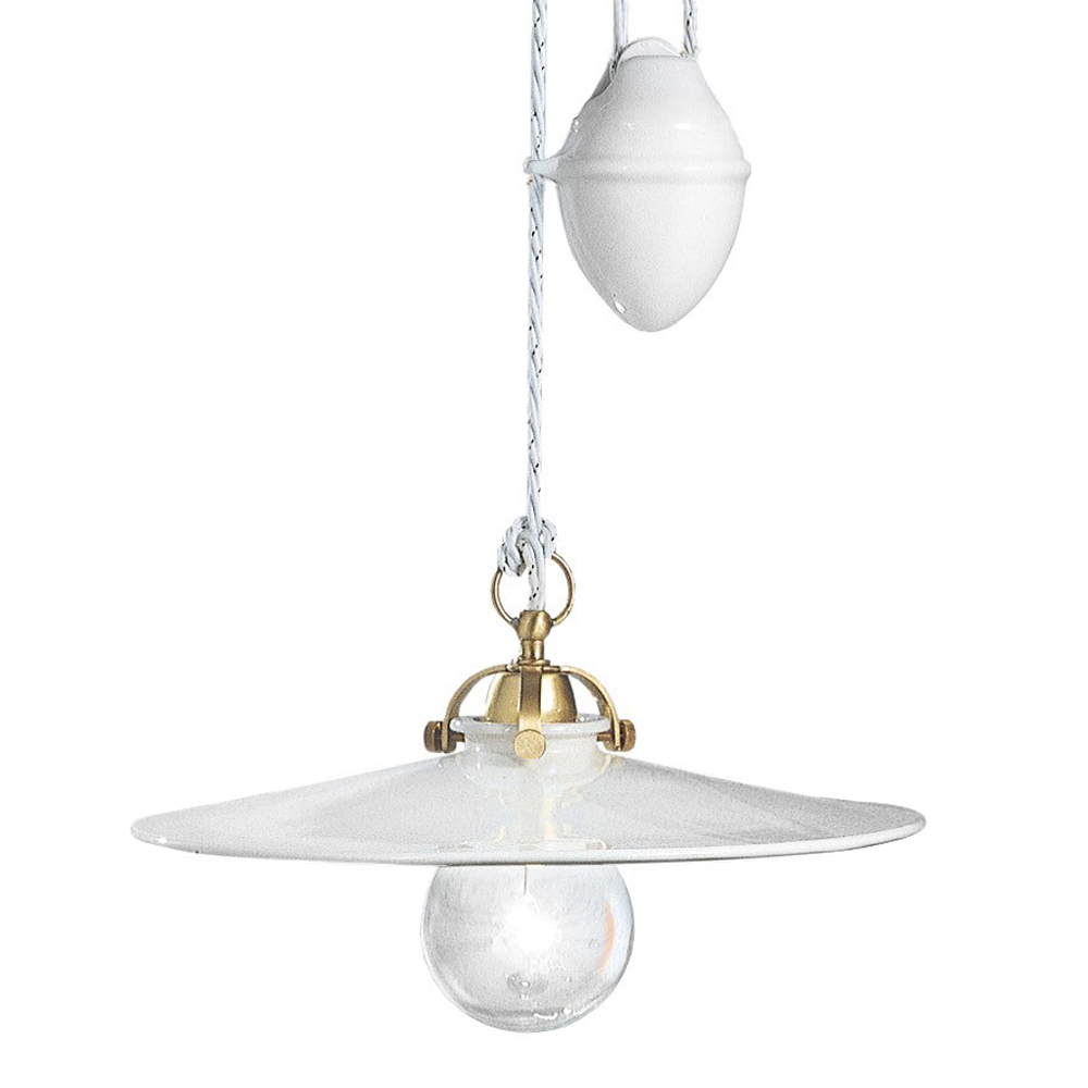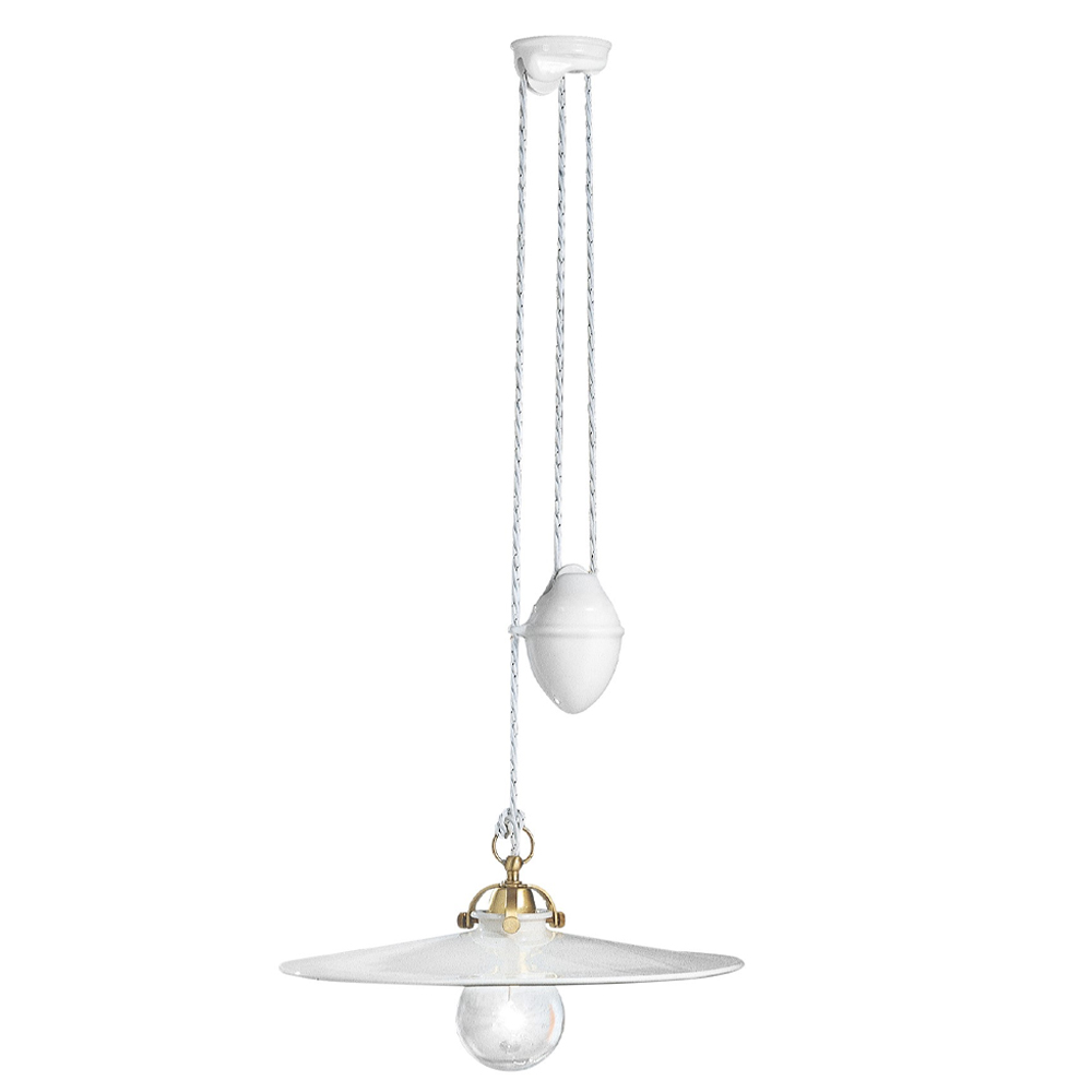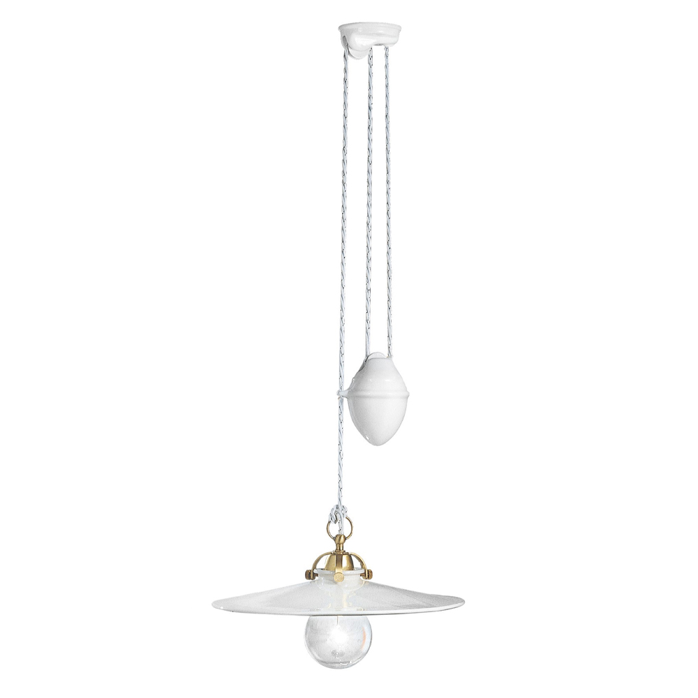 La lámpara de suspensión con raíl corredero está realizada íntegramente en hierro y cerámica brillo , materiales que destacan la destreza y destreza manual de los artesanos.