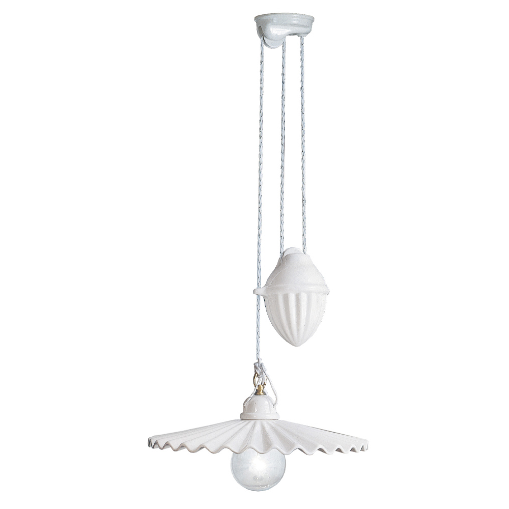 La lámpara de suspensión con raíl deslizante está realizada íntegramente en cerámica brillante plisada que destaca la destreza y destreza de los artesanos.