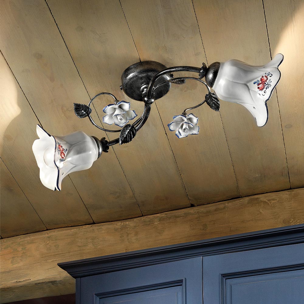 Plafón de 2 luces en metal y cerámica con rosas pintadas a mano fabricada en Italia por Ferroluce.