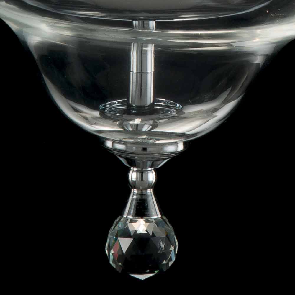 Araña de cristal transparente hecha a mano con adornos de cristal. Acabados cromados.