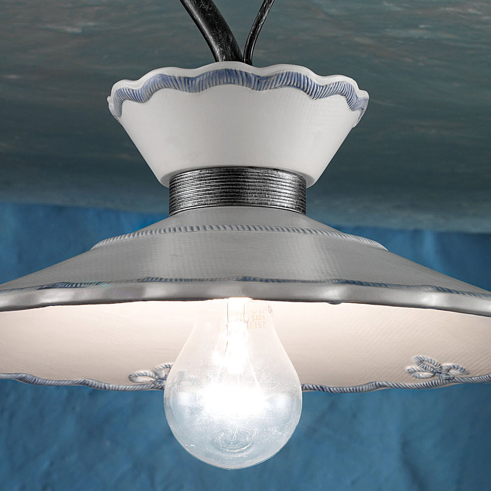 Esta lámpara de techo está realizada íntegramente a mano en metal y cerámica con decoración pintada a mano, para resaltar la habilidad y destreza manual de los artesanos. El diseño se caracteriza por laremiten a los bordados de los kitsdel pasado presente en la forma de la cerámica y en los detalles de los marcos.