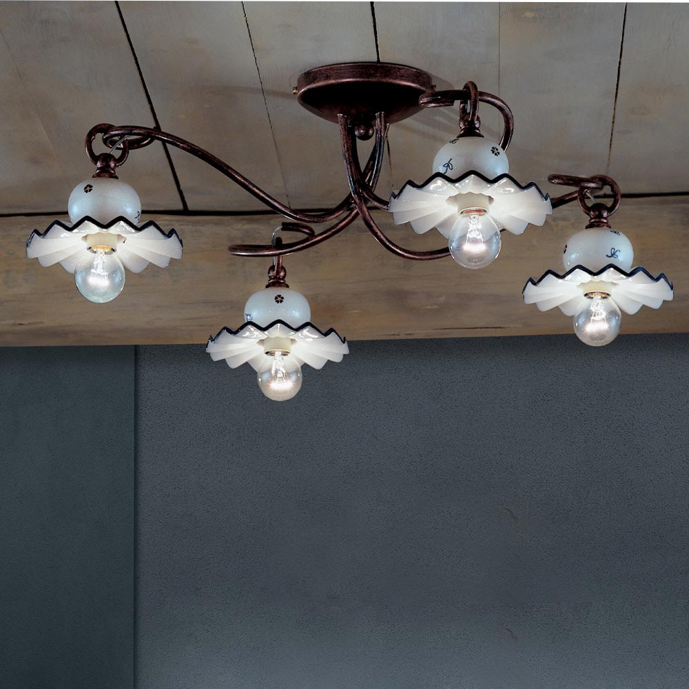 Plafón artesanal de 3 o 4 luces en metal y cerámica pintada a mano fabricado en Italia por Ferroluce.