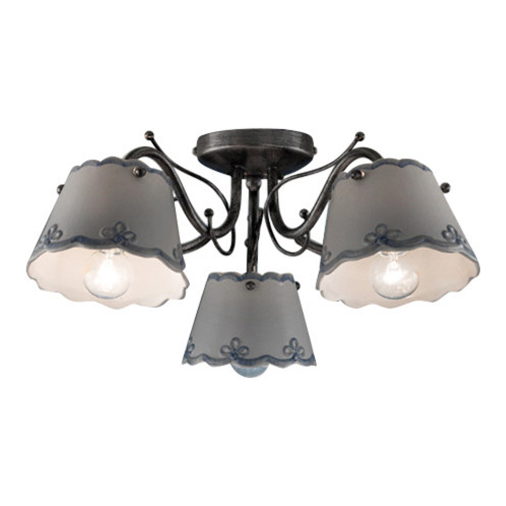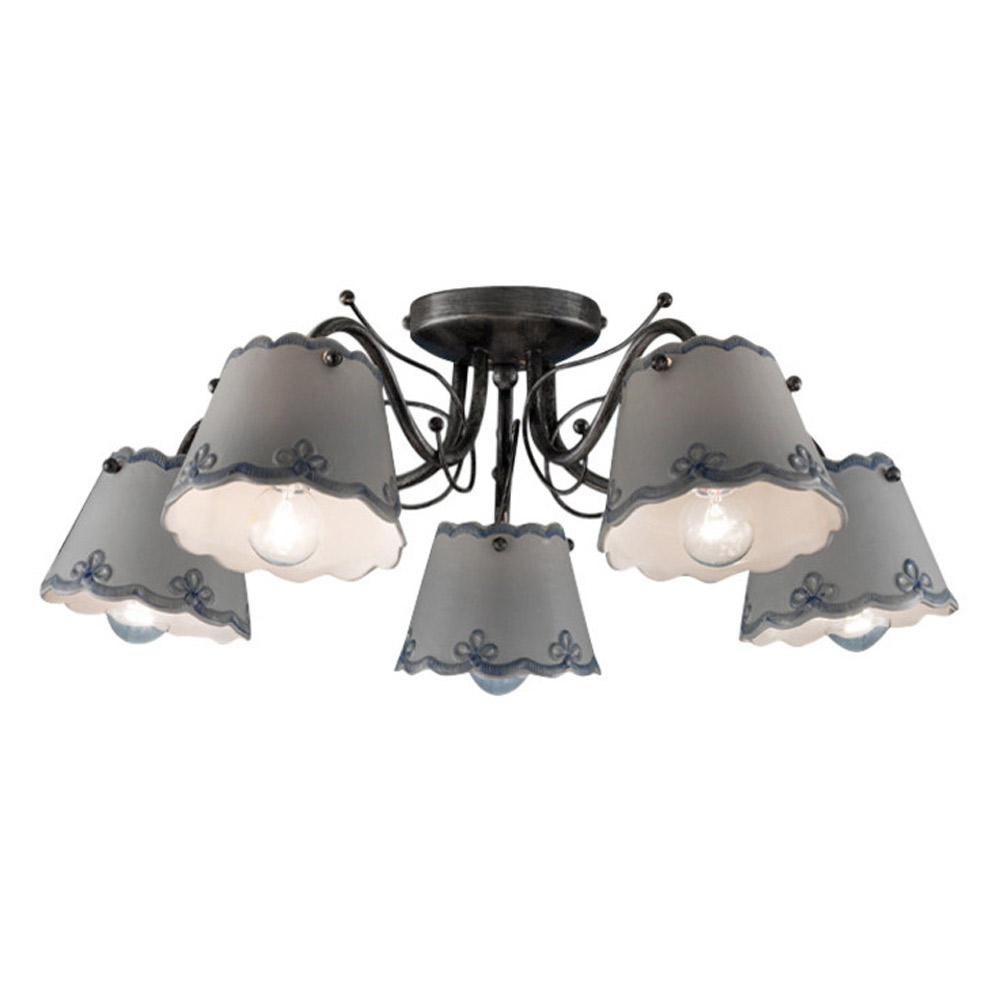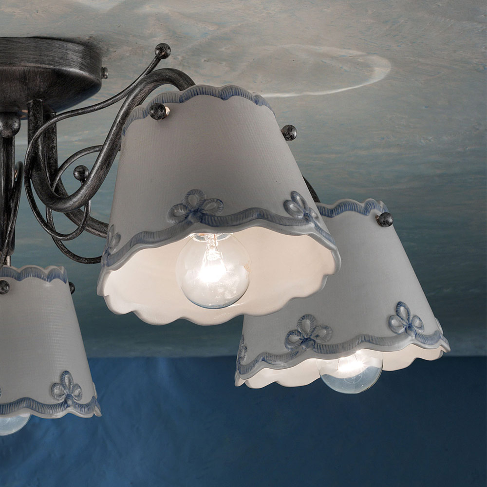 Plafón de 3 o 5 luces elaborado en metal y cerámica con efecto bordado, fabricado en Italia por Ferroluce.