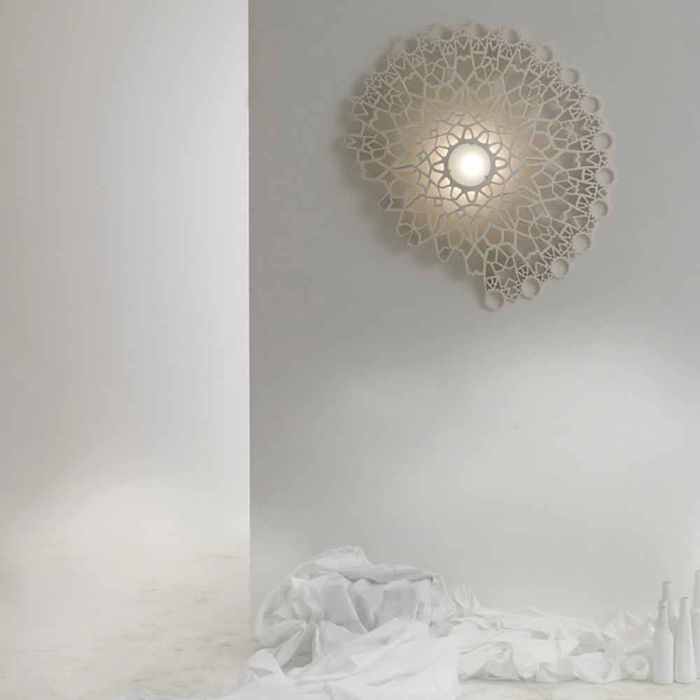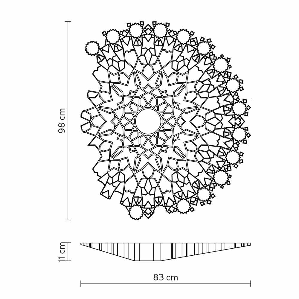 Este original y singular plafón o aplique evoca el encanto de la luz natural que se irradia entre los rosetones decorados de las catedrales góticas, creando atmósferas sugerentes y emotivas.
