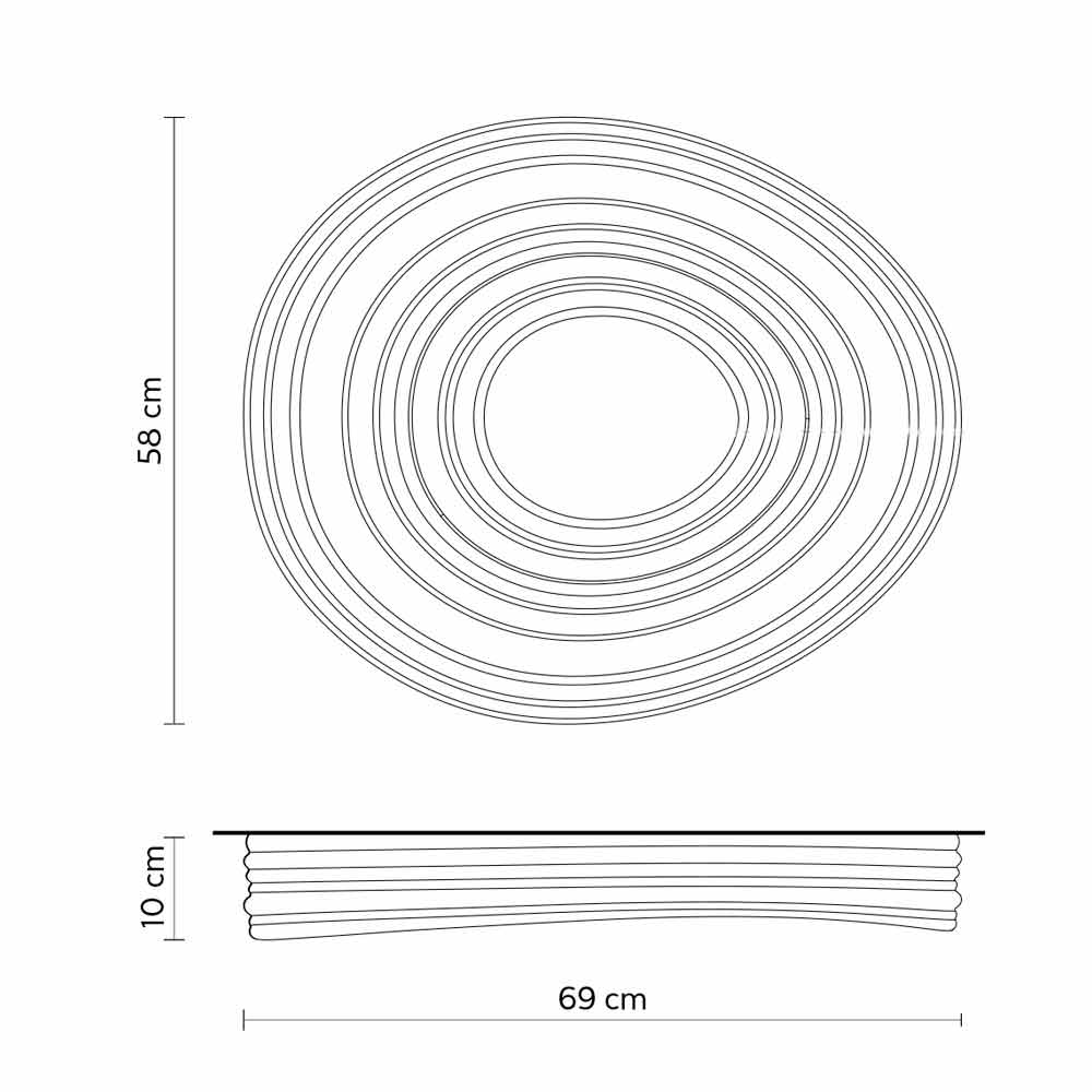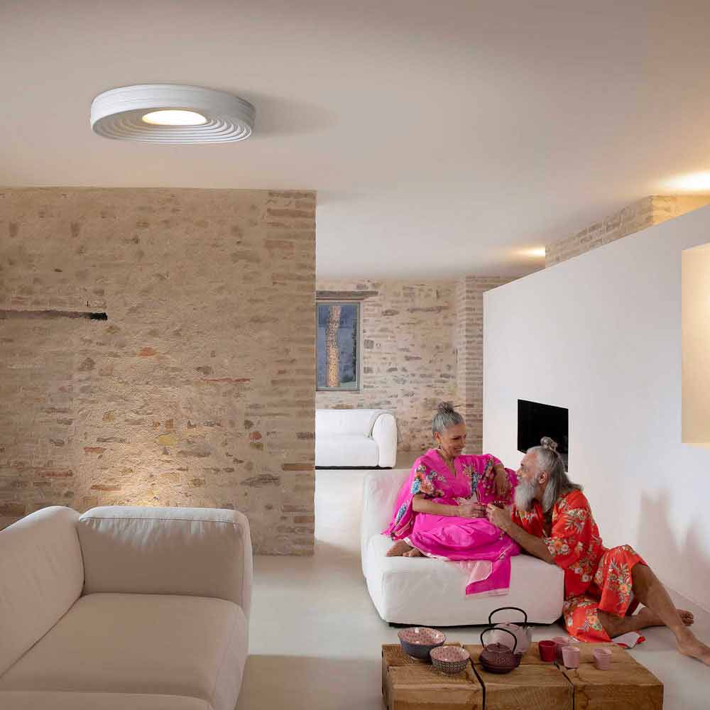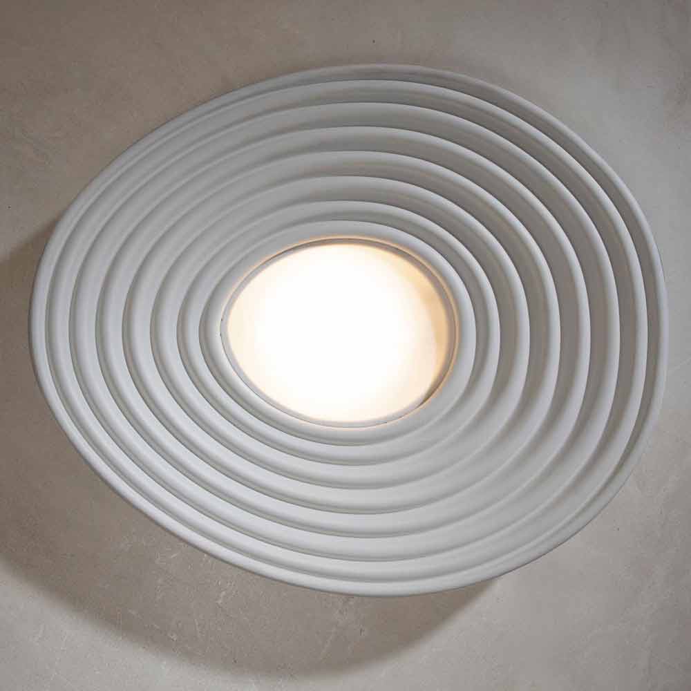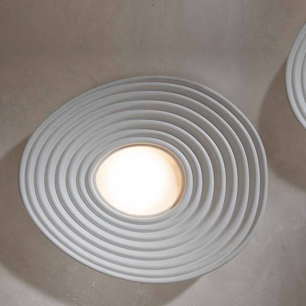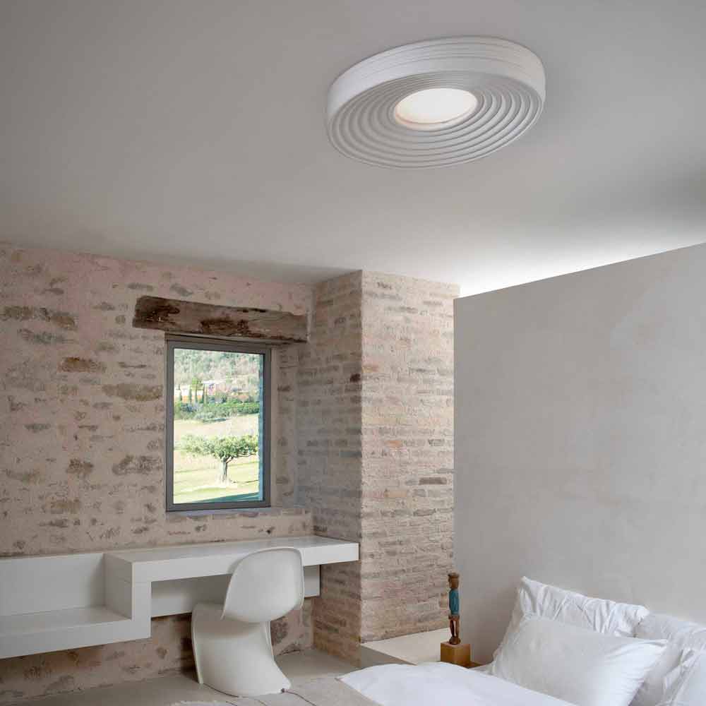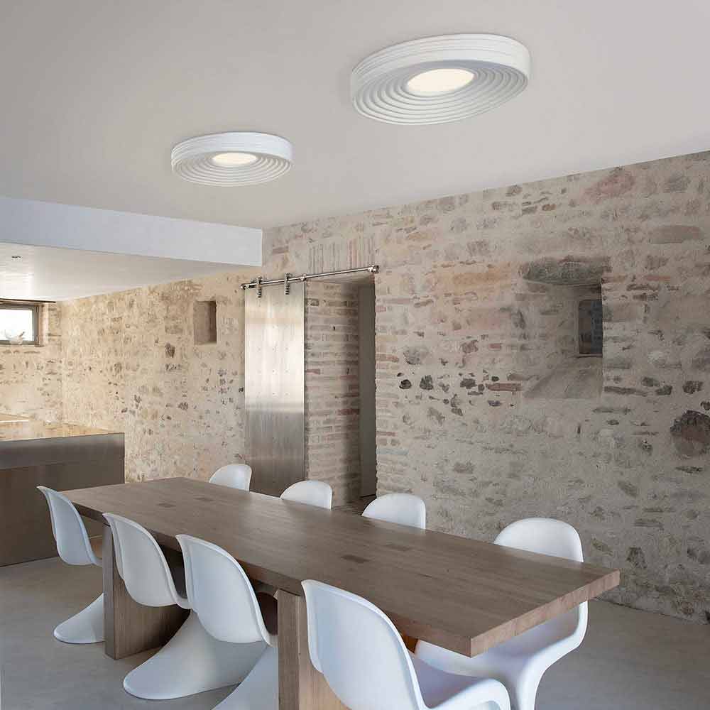 Este original y singular plafón crea maravillosos juegos de luz gracias a la parte central que garantiza la iluminación directa y que se propaga por la superficie de la lámpara, reflejándose en círculos concéntricos.