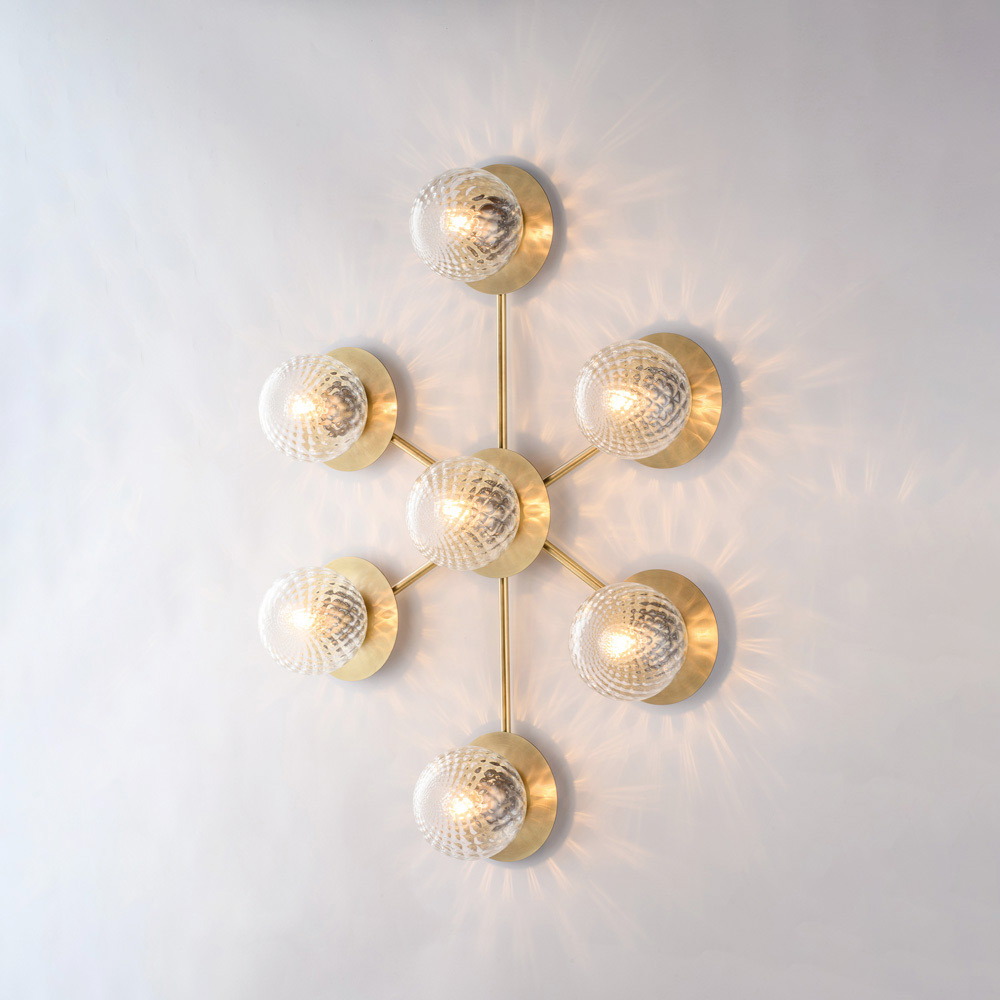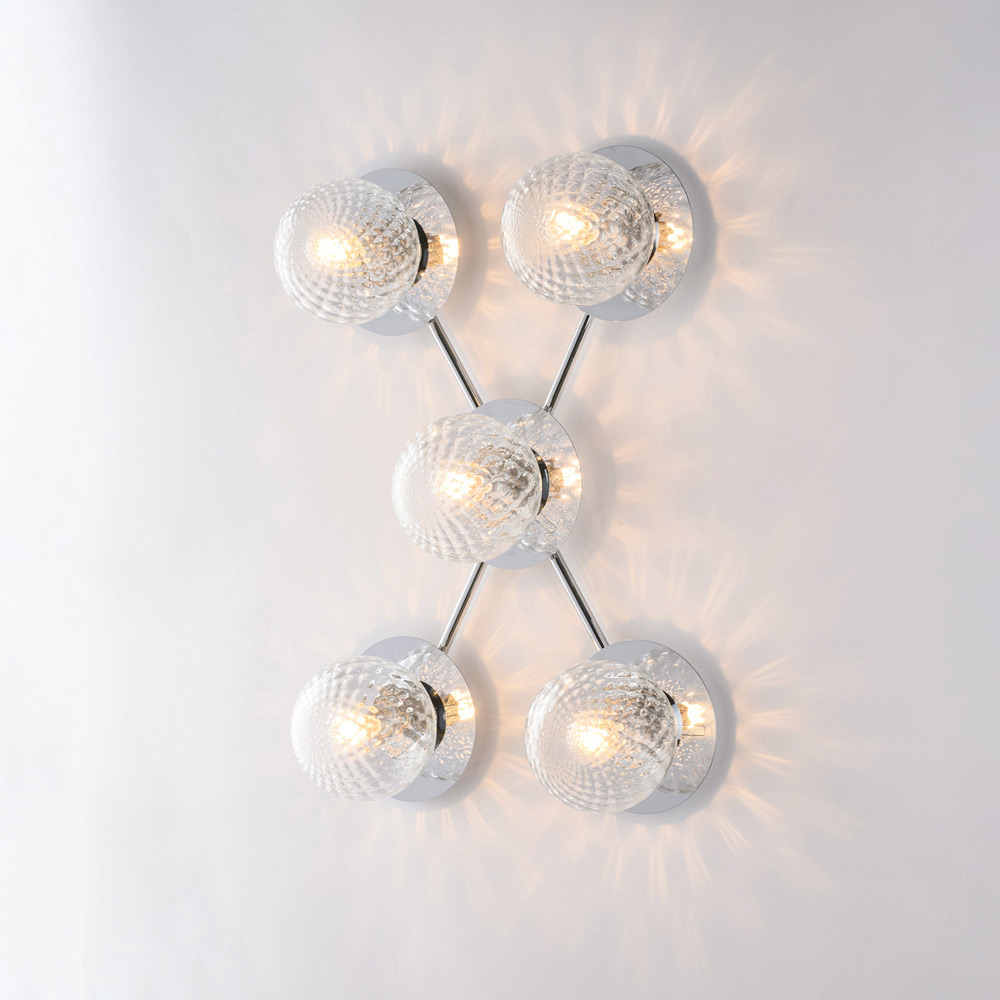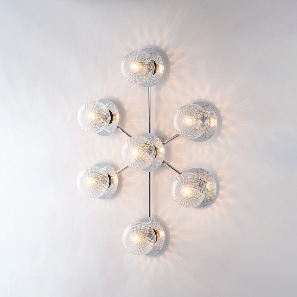 Dramática y contemporánea, esta lámpara de techo de hierro artesanal destaca por su composición dinámica y moderna. Su estructura ramificada alberga difusores esféricos de vidrio, dispuestos en un patrón equilibrado, creando un sugerente juego de luz y reflejos que realza el techo e ilumina la estancia de manera uniforme.