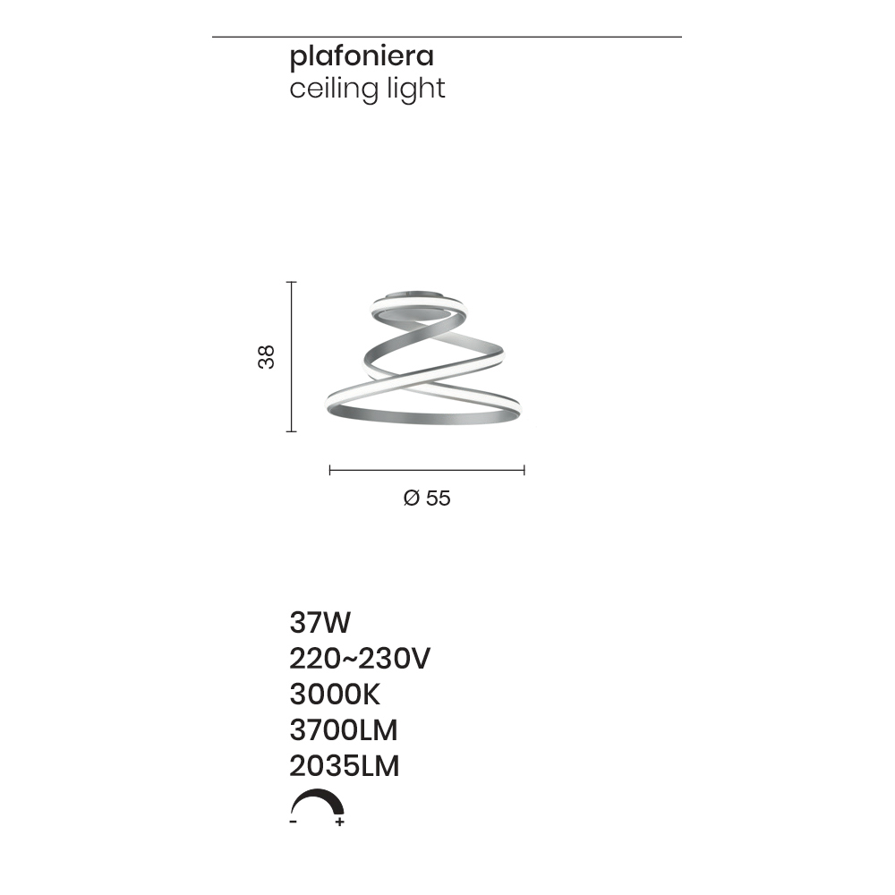 Lámpara de techo con estructura de metal pintado de blancocon fuente de luz LED . Un diseño dinámico y moderno capaz de recrear la sensación de una cinta que gira enriqueciendo así el valor y la estética del producto. Esta sensación de movimiento se convierte en su punto fuerte y le permite conquistar el centro de atención en ambientes domésticos o contract con un estilo contemporáneo y vanguardista. La moderna tecnología LED también asegura una iluminación de calidad completando la lámpara y convirtiéndola en un complemento óptimo para quienes buscan funcionalidad y diseño en un solo producto.