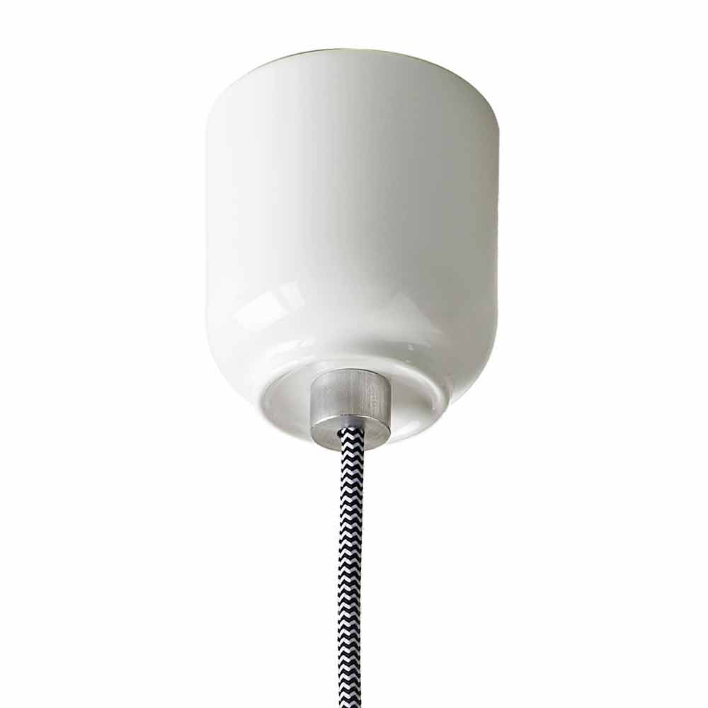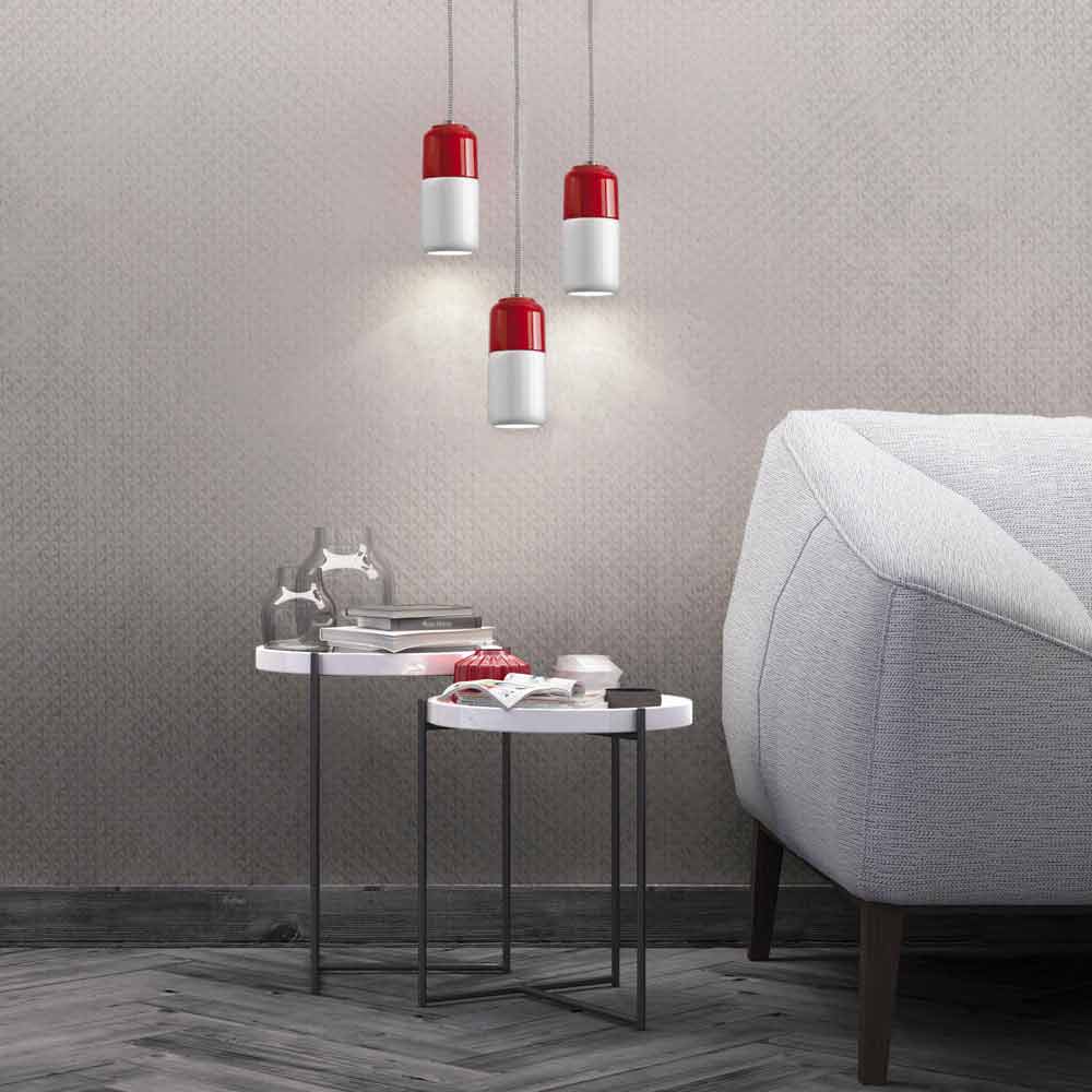 Hecho de cerámica roja y blanca con cable de tela blanco y negro y abrazadera de cable de aluminio. Decora con estilo y vivacidad cualquier ambiente, desde lo clásico hasta lo más moderno.