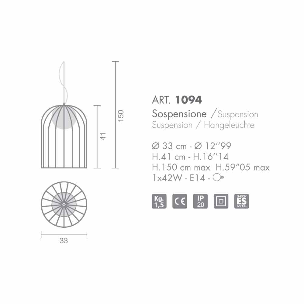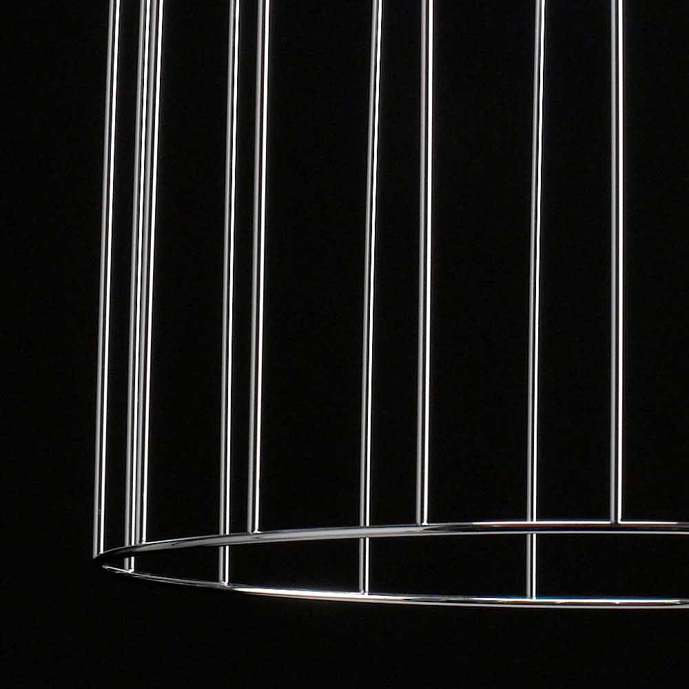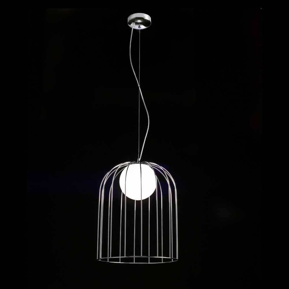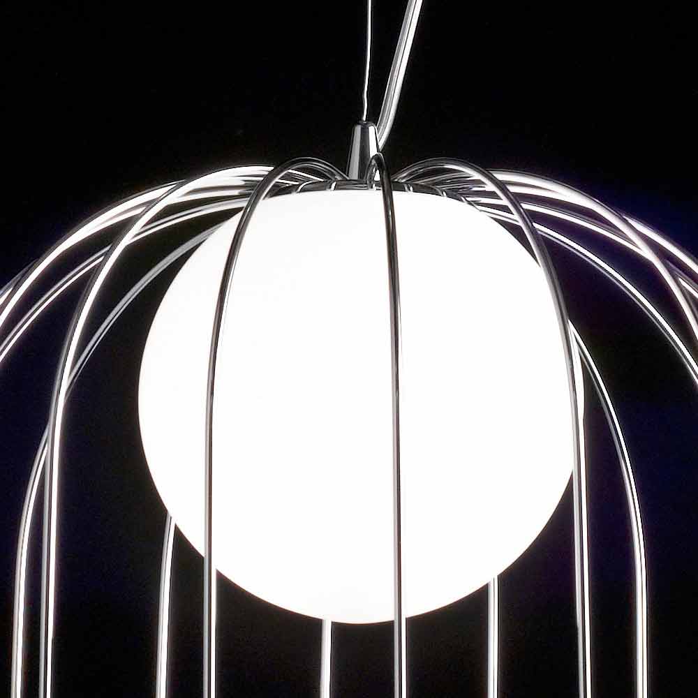 lámpara de techo de vidrio soplado Selene Kluvì con jaula de metal fabricado en Italia Kluvì es una colección de tres suspensiones y Te lámparas de apoyo, que pueden alcanzar un tamaño considerable, que consiste en una jaula de metal y una esfera de vidrio soplado de color blanco lechoso. Acabado: cromo; Está dispuesto para utiizzo 1 42W bombilla - E14.