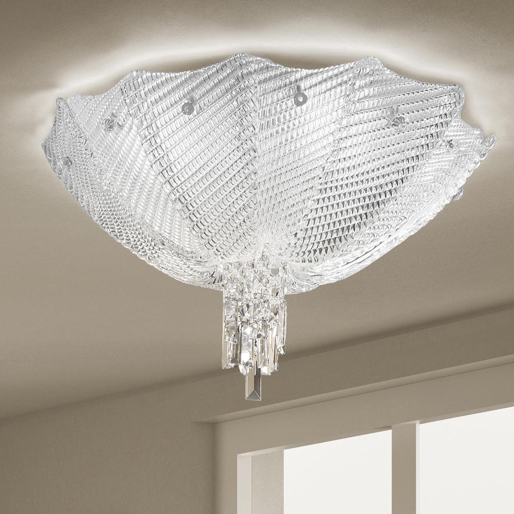 trabajo en caliente del vidrio que también está adornado con prismas colgantes que enfatizan y hacen que la refracción de la luz sea única para un resultado único, exclusivo y refinado.