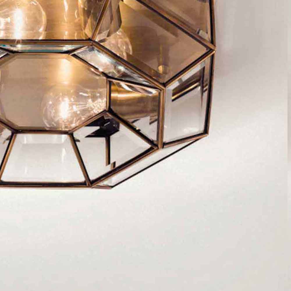 Esta lámpara de techo de interior está inspirada en las formas geométricas y puras de la antigua tradición. Es un símbolo de diseño de la tradición artesanal italiana pero al mismo tiempo moderno y capaz de adaptarse a varios contextos, para un artículo de alta calidad y significativo. Un producto único y exclusivo, íntegramente hecho a mano en Italia en vidrio biselado y estructura base en latón bruñido.