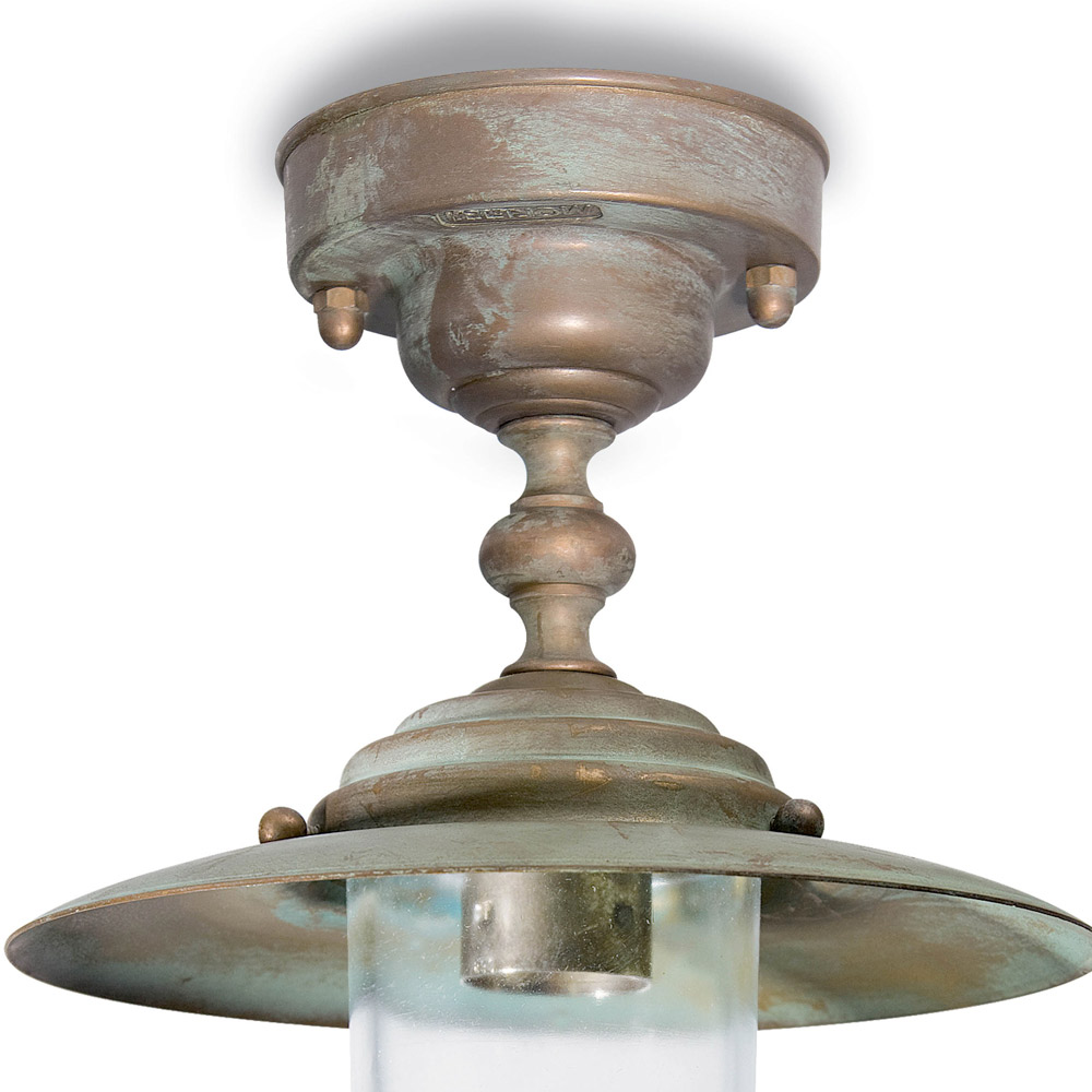 Auténtica y atemporal, esta lámpara de techo para exteriores evoca el encanto de los faroles tradicionales, reinterpretada con un toque elegante. Su estructura de latón artesanal destaca por su acabado antiguo , que realza la textura del metal y le confiere un aspecto refinado y envejecido.