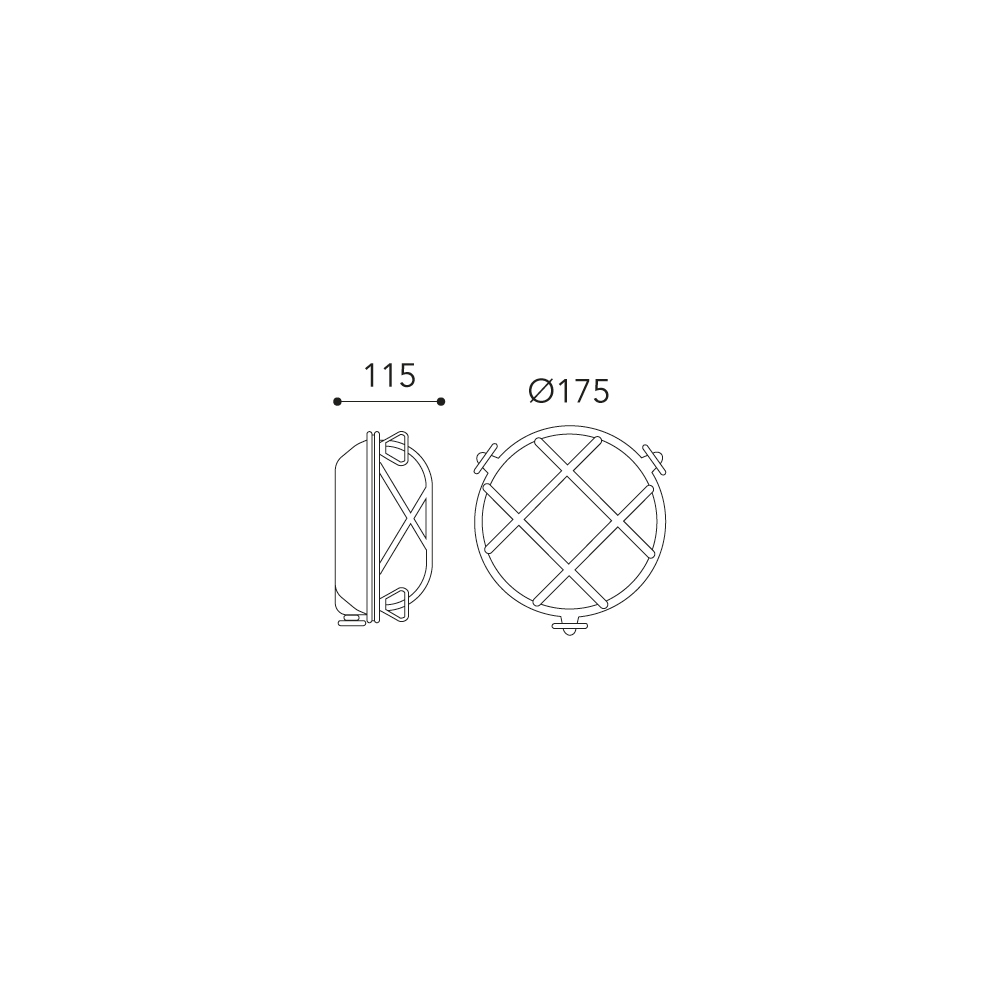 El difusor redondo de vidrio opalino está protegido por una sólida rejilla metálica que evoca el mundo náutico e industrial, garantizando a la vez seguridad y durabilidad . La luz es funcional y envolvente , perfecta para iluminar fachadas , entradas , escaleras exteriores y espacios exteriores .