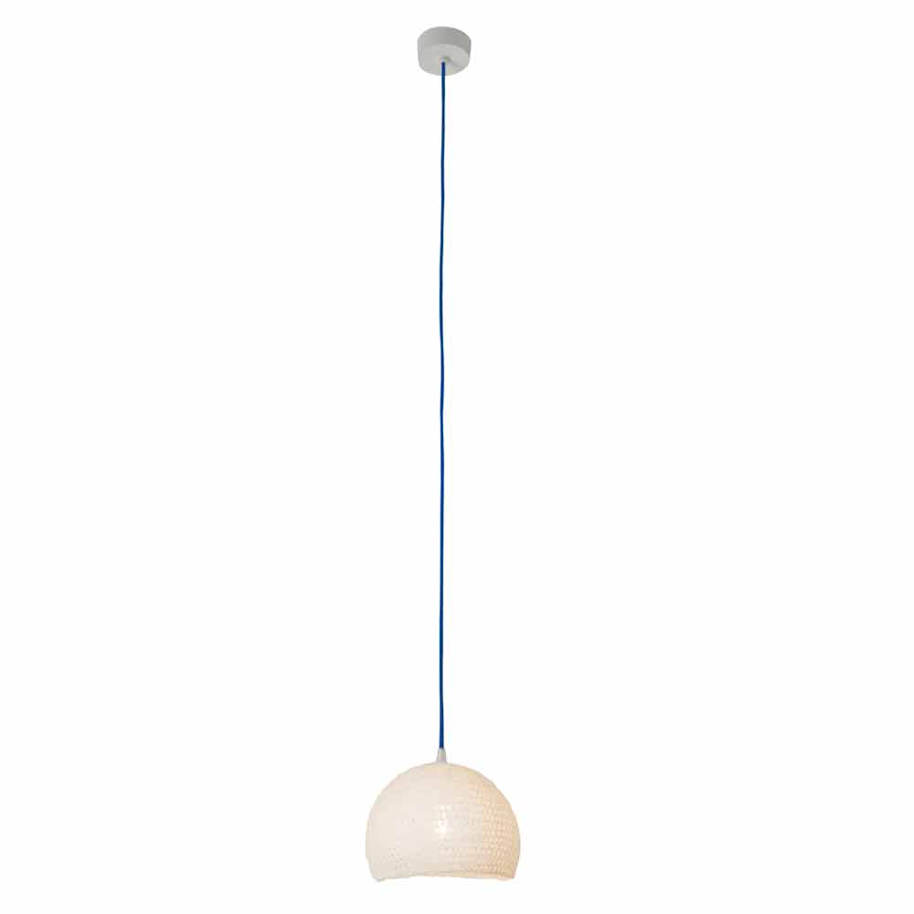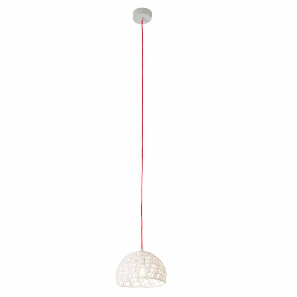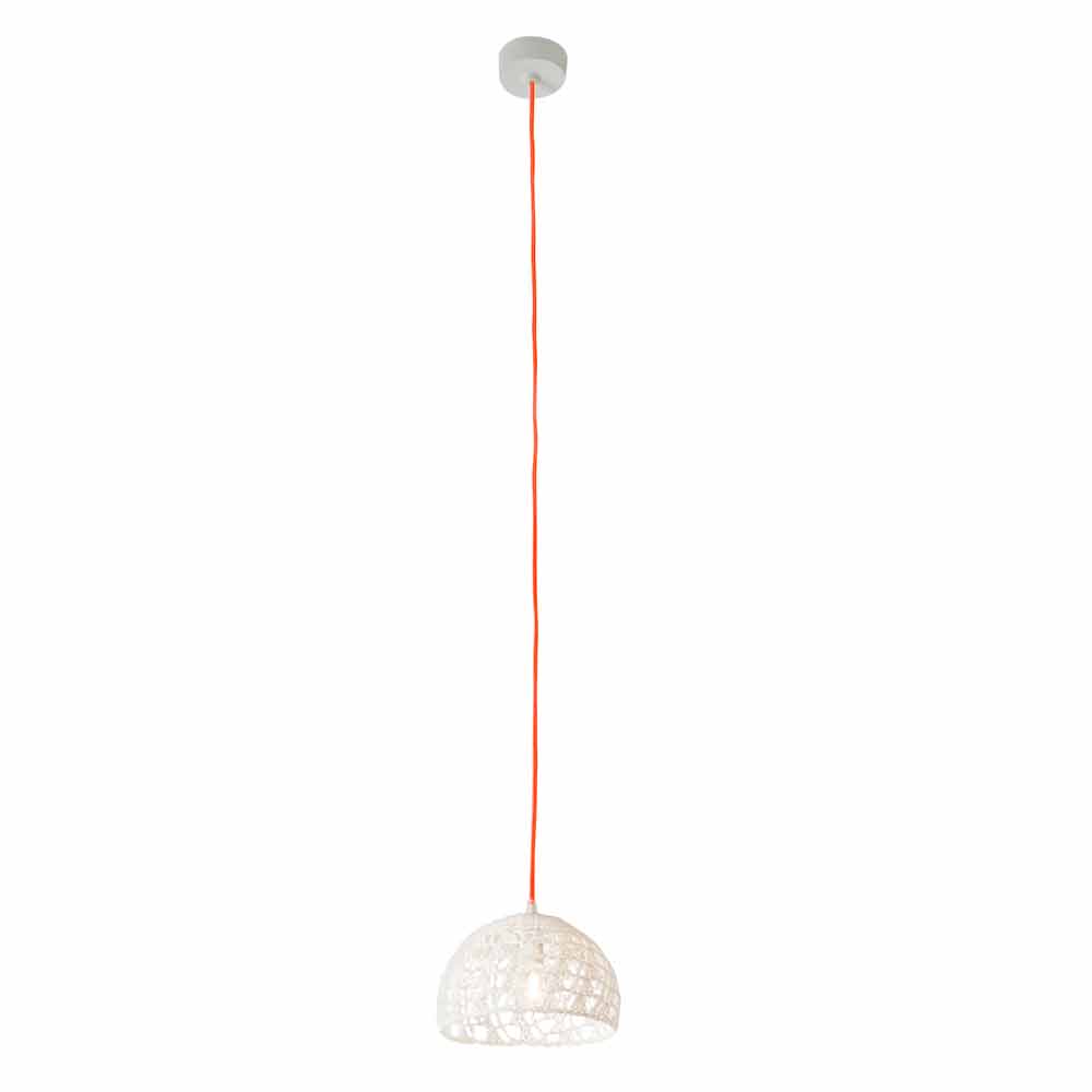 Su estructura tejida a mano en algodón y viscona está cubierta con resina blanca. El toque de color le da el cable eléctrico, disponible en seis colores diferentes y dos tamaños diferentes: colores: - Cordon blanco, amarillo; - Cable blanco, rojo. - Cable blanco, azul; - Cordon blanco, blanco; - Blanco, cordón dorado; - Cordón blanco, naranja fluorescente. Medidas: - Ø 21 x H 16 cm Rosetón Ø 9x4 cm; - Ø 21 x H14 cm Rosetón Ø 9x4 cm.