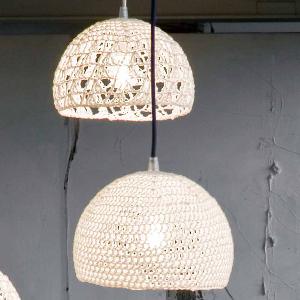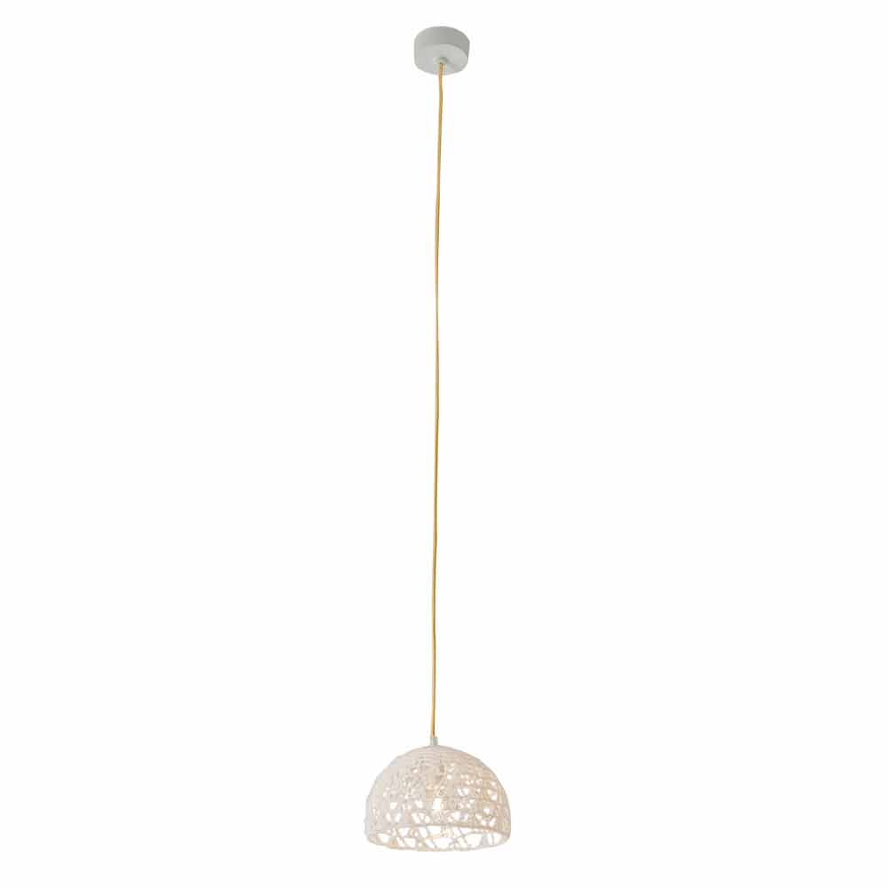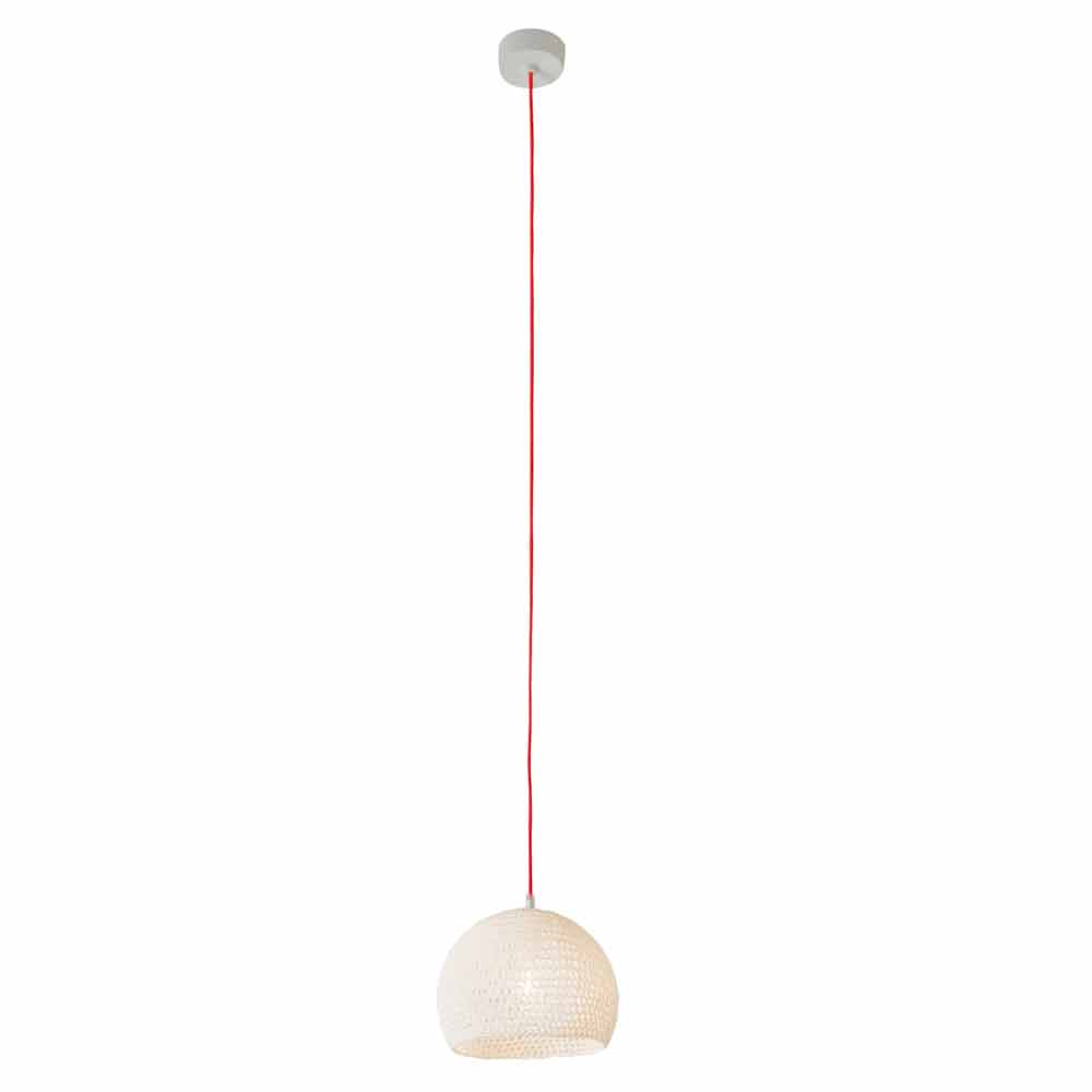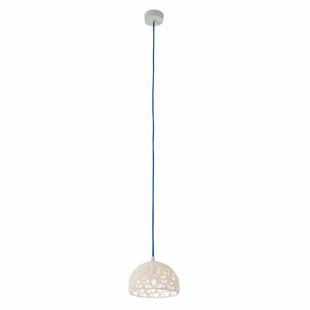 Su estructura tejida a mano en algodón y viscona está cubierta con resina blanca. El toque de color le da el cable eléctrico, disponible en seis colores diferentes y dos tamaños diferentes: colores: - Cordon blanco, amarillo; - Cable blanco, rojo. - Cable blanco, azul; - Cordon blanco, blanco; - Blanco, cordón dorado; - Cordón blanco, naranja fluorescente. Medidas: - Ø 21 x H 16 cm Rosetón Ø 9x4 cm; - Ø 21 x H14 cm Rosetón Ø 9x4 cm.