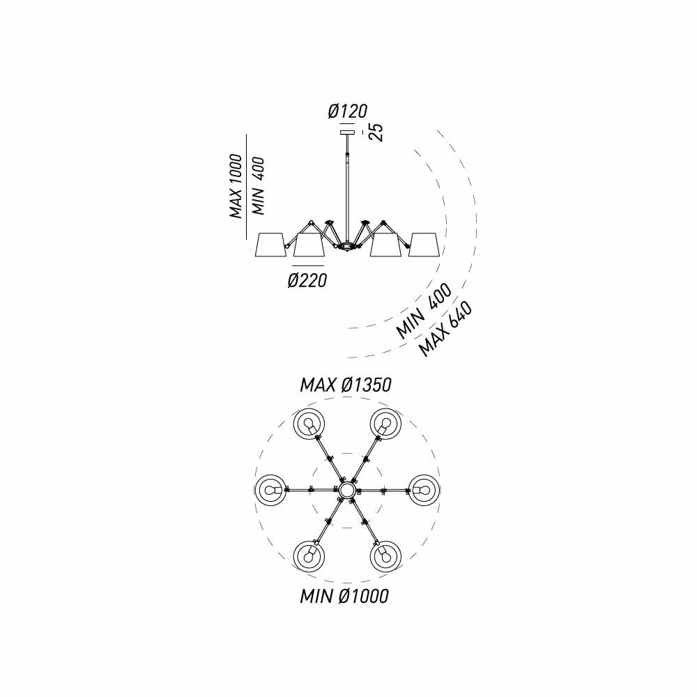 Medidas Difusor: Ø220 mm; suspensión máxima h. 1000 mm; dimensiones totales máximas 1350 mm; Roseta Ø120 mm