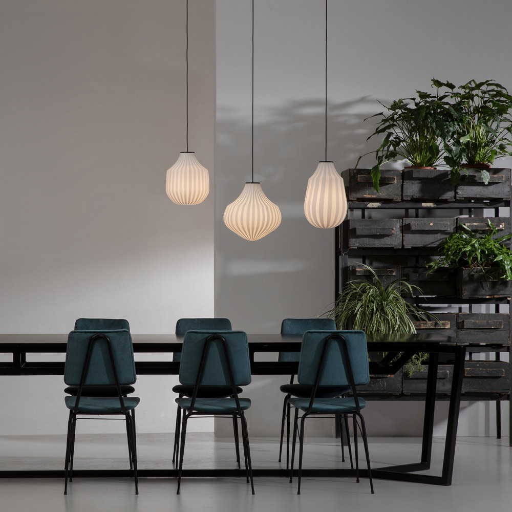 La lámpara está realizada con un difusor de vidrio de filigrana blanca de forma artesanal , un material que otorga brillo y modernidad a la luz, que la atraviesa creando atmósferas sublimes y atractivas, y una base de aluminio extraíble.
