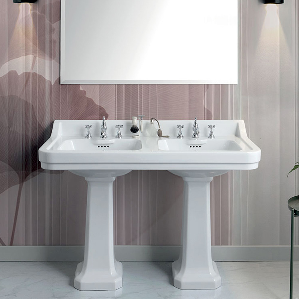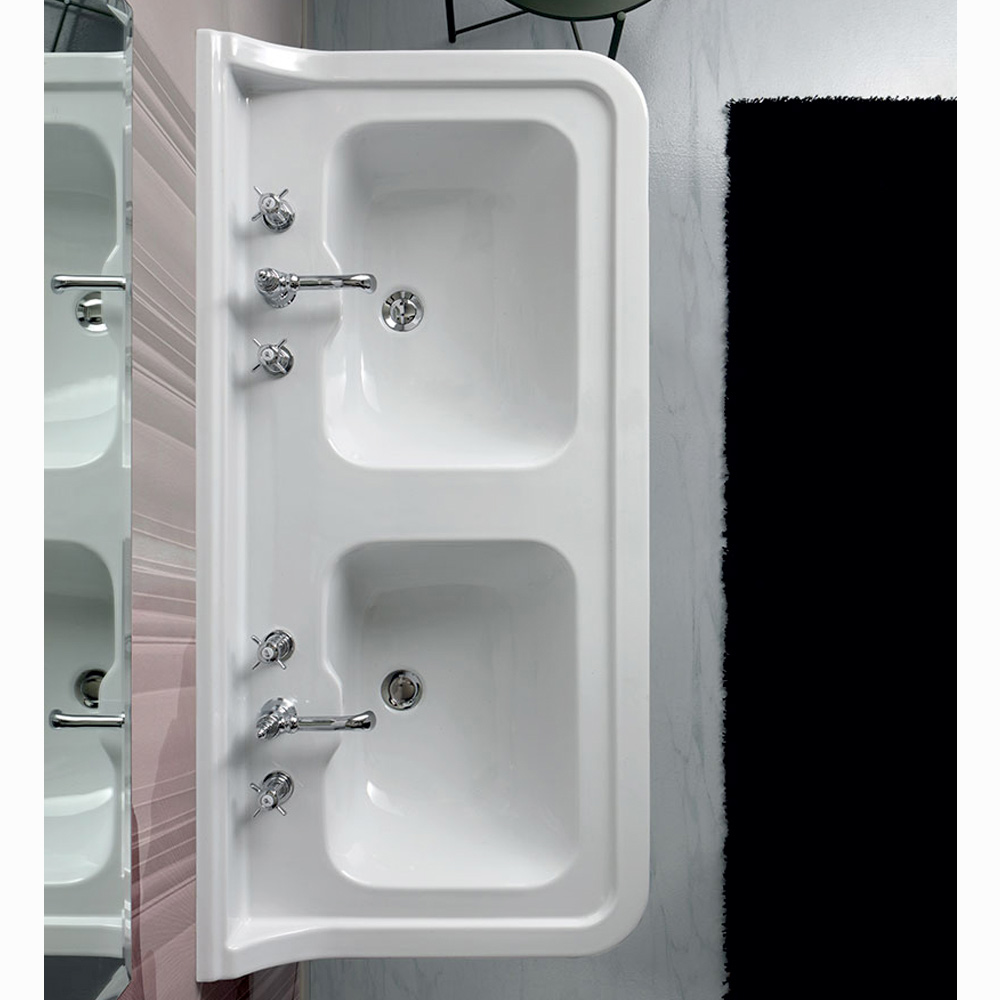 Lavabo consola con doble lavabo realizado en cerámica blanca brillante mediante una producción artesanal 100% Made in Italy . Un mueble que da vida a diseños clásicos de antaño para amueblar espacios de baño igualmente clásicos con carácter pero también ambientes modernos en los que jugar con contrastes de estilo originales y sin precedentes .