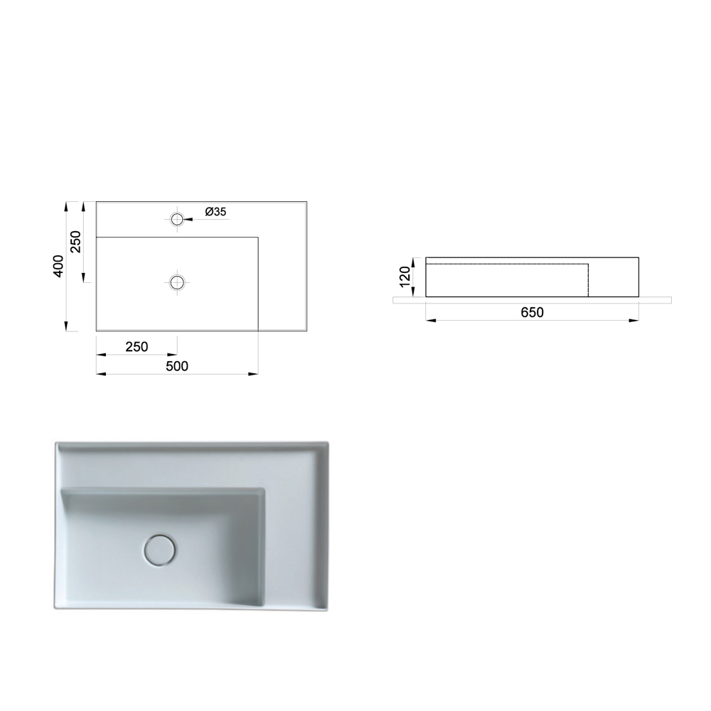 Características: - Lavabo de instalación sobre encimera - Incluye desagüe cerámico a juego con el lavabo - Sin orificio para grifería