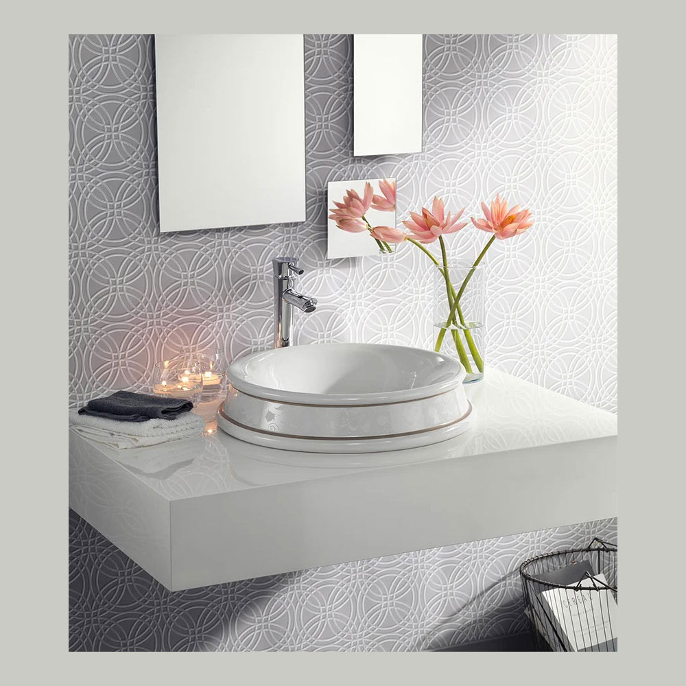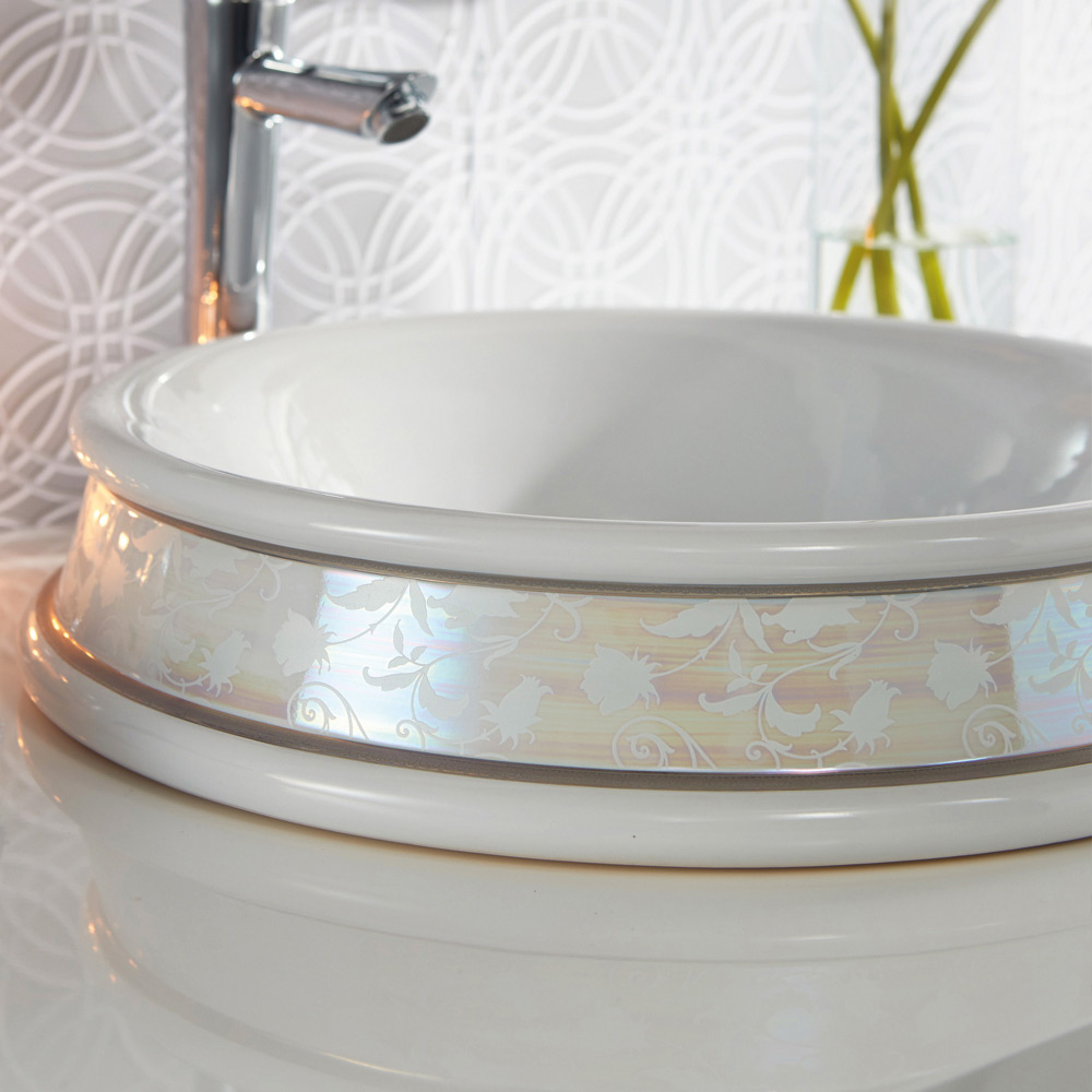 Lavabo de baño semiencastrado en arcilla refractaria con encaje bordado tono sobre tono , íntegramente Made in Italy. La forma y acabado de este producto fueron pensados para decorar el baño con muebles elegantes e impactantes, únicos en su tipo. La calidad y la funcionalidad típicas de un producto Made in Italy no se han pasado por alto eligiendo los mejores materiales y confiando la producción a expertos artesanos italianos.