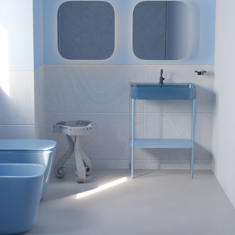 La estructura, con un estante inferior , no sólo sostiene el fregadero con elegancia sino que también proporciona una útil zona de almacenamiento, optimizando el espacio sin renunciar al estilo.