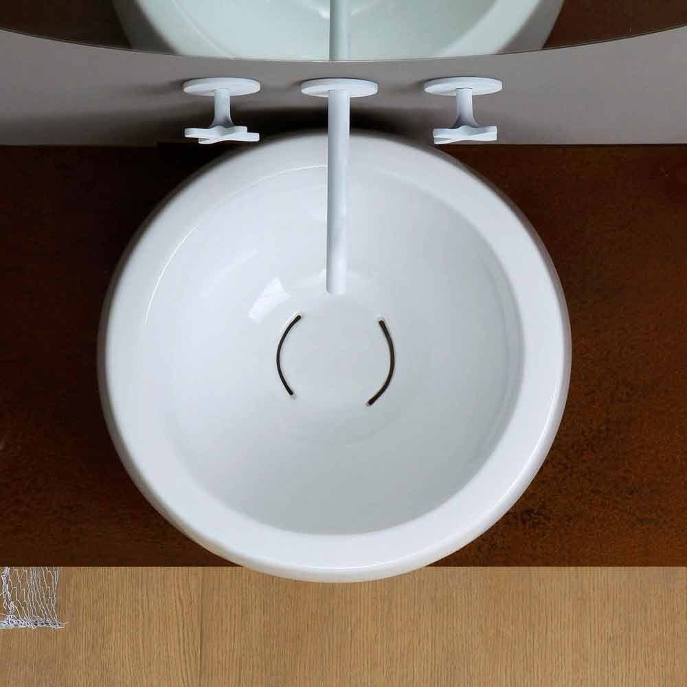 Lavabo sobre encimera de cerámica de diseño circular hecho en Italia Elisa Elisa contiene recuerdos y sabores de África, con forma circular y un importante borde voladizo. El doble corte del desagüe permite el flujo continuo de agua.