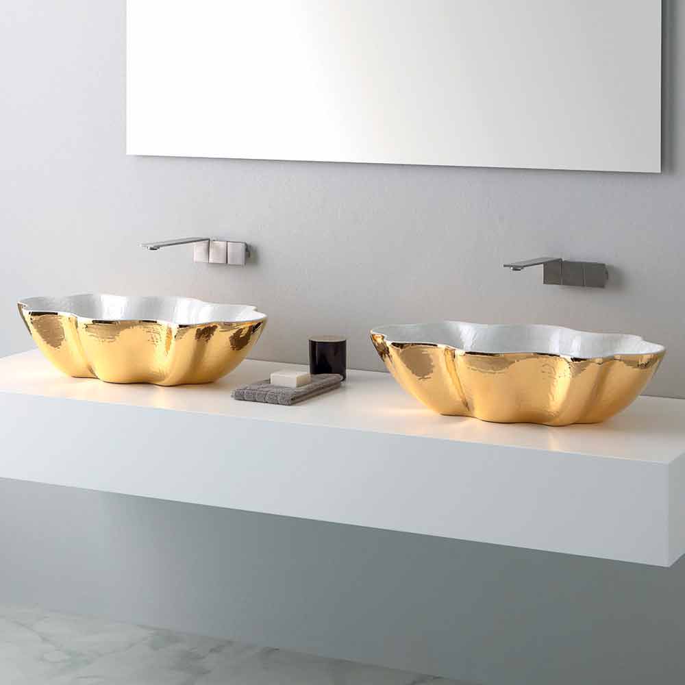 Lavabo sobre encimera de diseño moderno en cerámica Cubo made in Italy Cubo es un lavabo sobre encimera fabricado en Italia en cerámica de extralujo en dos colores dorado y blanco. Caracterizado por un diseño equilibrado y definido; de hecho, su perímetro recuerda mucho a una estrella de mar.