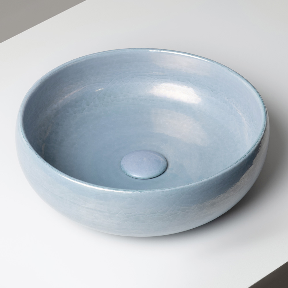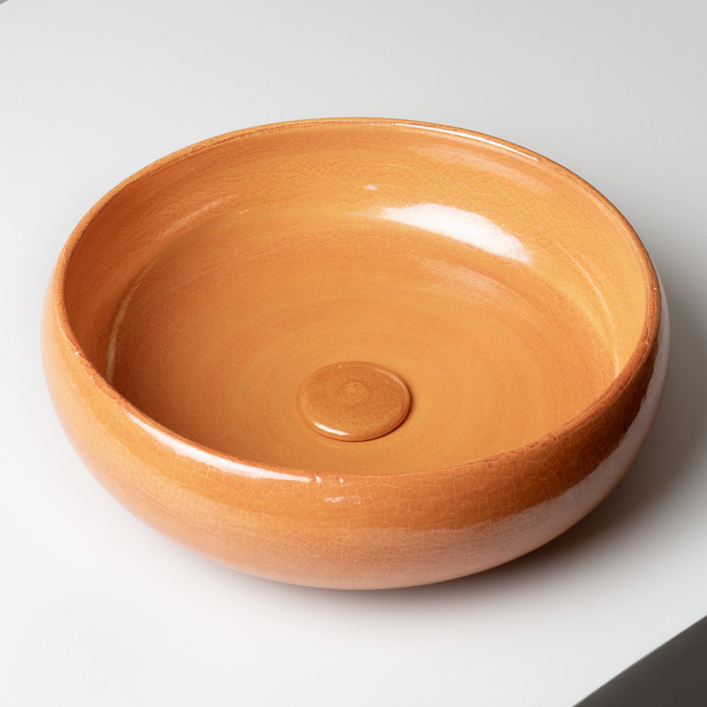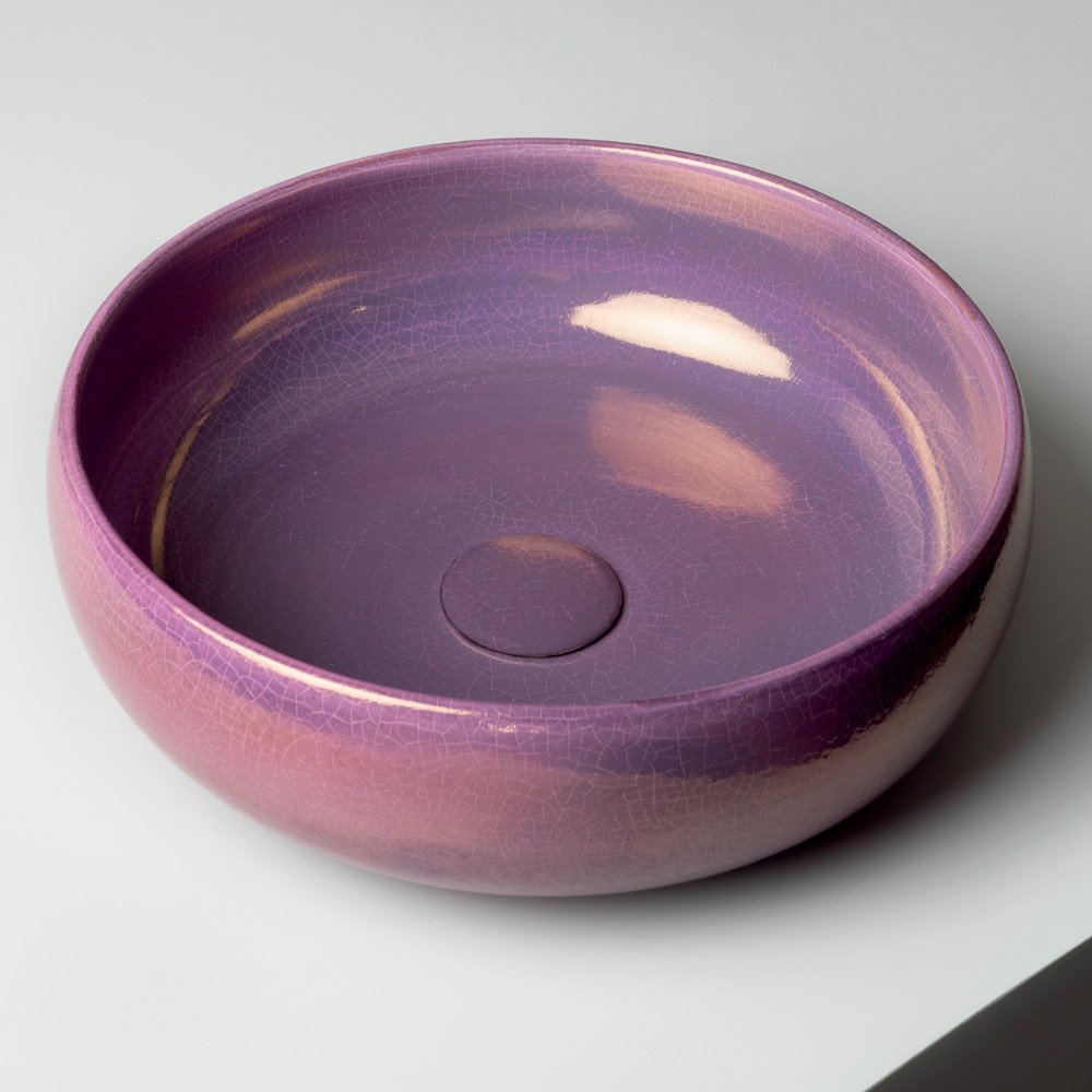 La forma esencial y primordial se equilibra con proporciones armoniosas, mientras que la superficie esmaltada crea reflejos vibrantes e irregulares que hacen que cada lavabo sea único. El característico craquelado Raku realza el aspecto texturizado y artesanal del producto, transformándolo en un auténtico elemento decorativo.