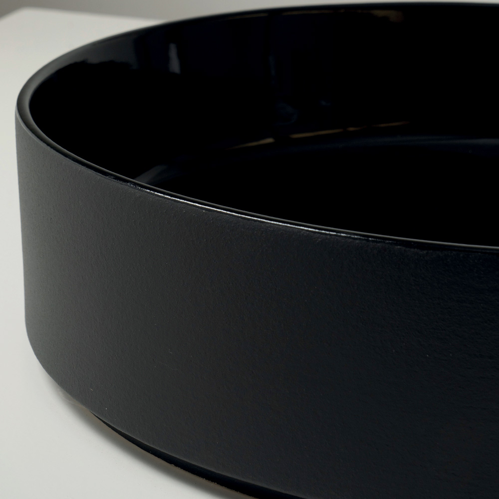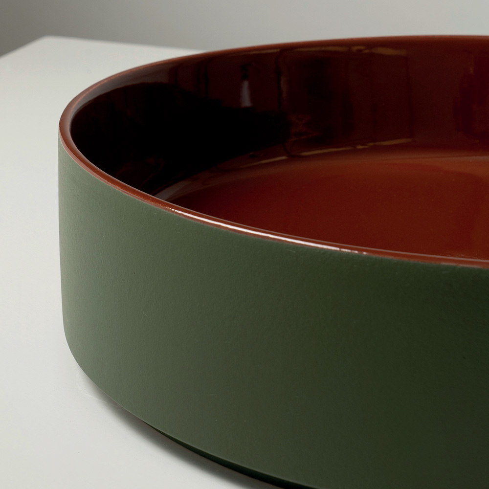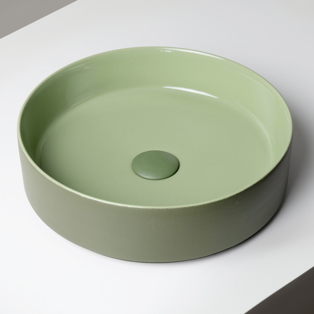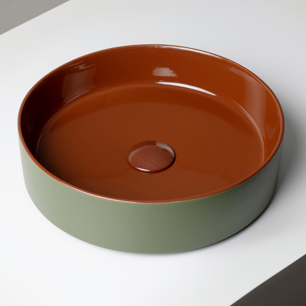 El lavabo de sobre encimera está fabricado en gres porcelánico torneado a mano y presenta un diseño contemporáneo que combina la simplicidad formal con una marcada identidad cromática. Fabricado íntegramente en Italia , está diseñado para baños modernos y distintivos donde el color cobra protagonismo.