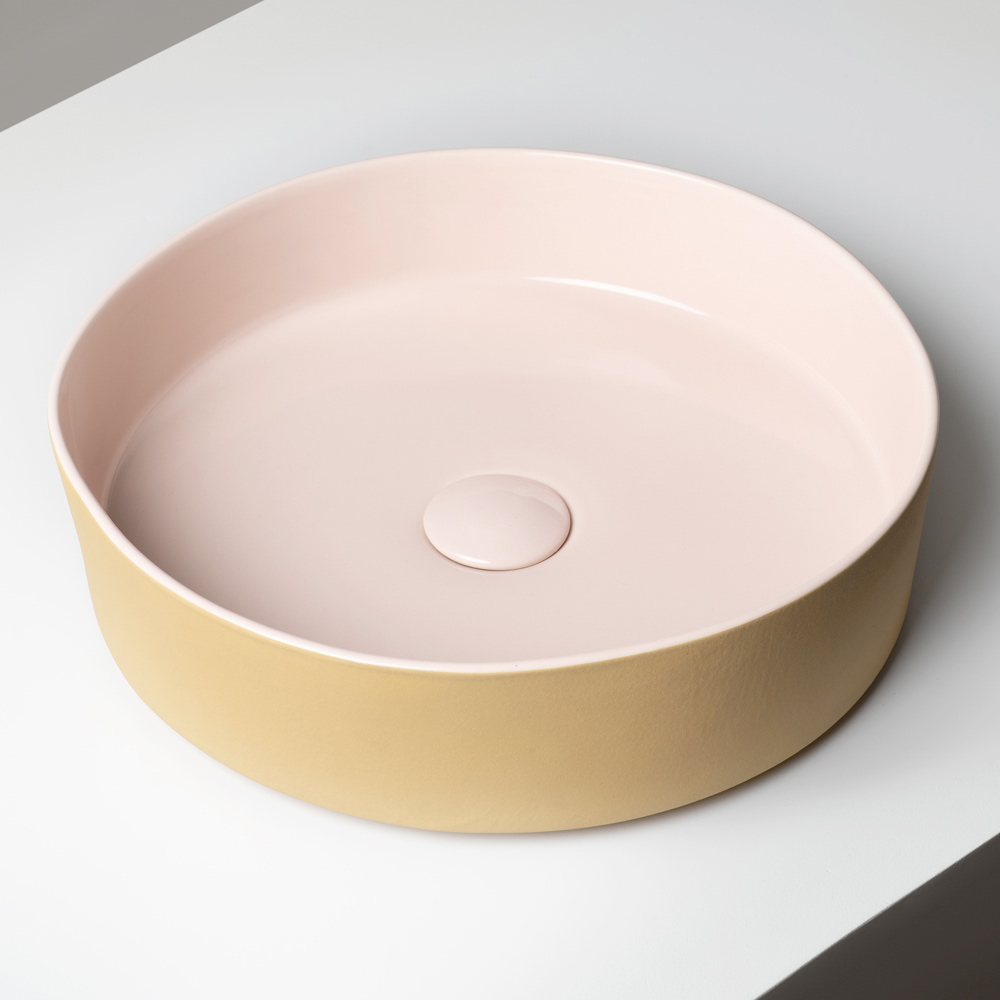 La forma esencial y compacta se ve realzada por un refinado contraste entre el interior brillante y el exterior mate , creando un elegante juego visual entre superficies y tonos. Las combinaciones de colores, inspiradas en una paleta vibrante y sofisticada, convierten cada lavabo en un auténtico elemento decorativo.
