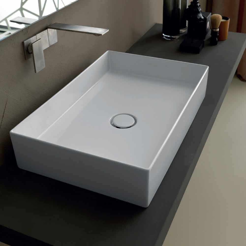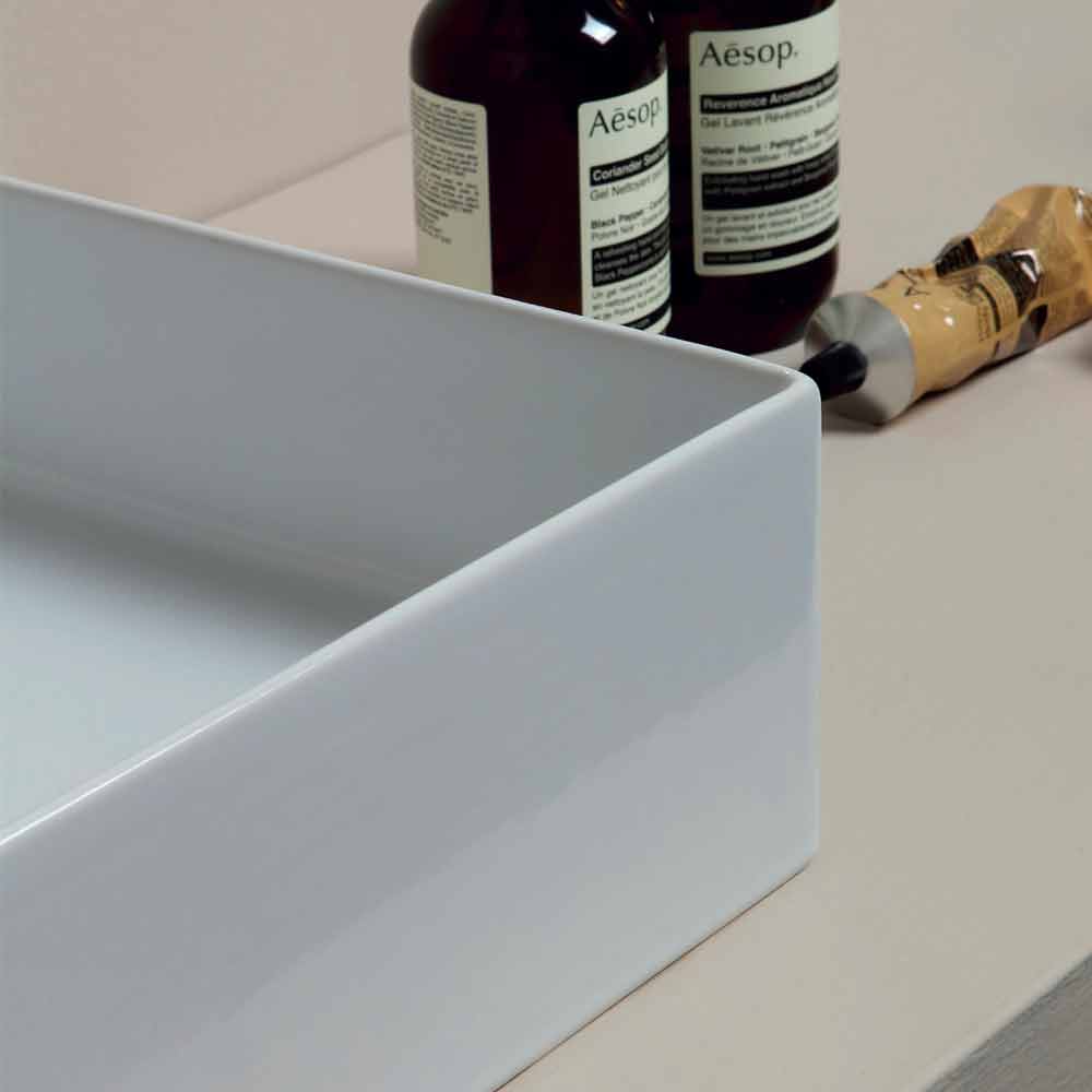 Lavabo sobre encimera de diseño moderno Sun 60x37, hecho en Italia La colección Ceramic in the Sun alcanza espesores muy finos para crear formas puras y elegantes. Los sanitarios de la línea Sun presentan una solución técnica innovadora para optimizar la limpieza y garantizar una mayor higiene y facilidad de uso. NÓTESE BIEN:Desagüe de cerámica de descarga libre incluido, grifo excluido. Como opción es posible tener el sifón redondo de latón.