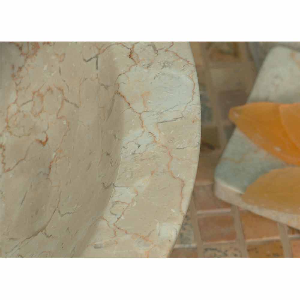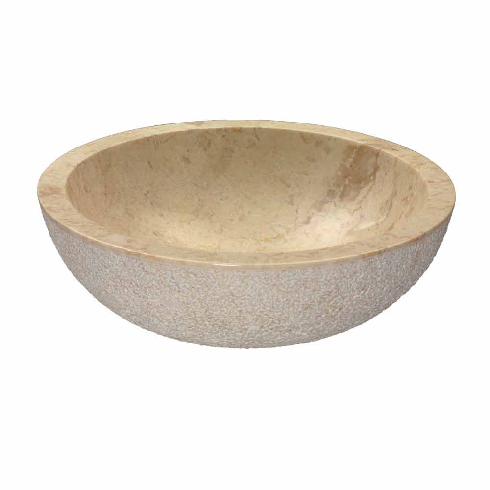 Lavabo redondo sobre encimera realizado en piedra natural beige con parte externa rugosa modelo Pai.