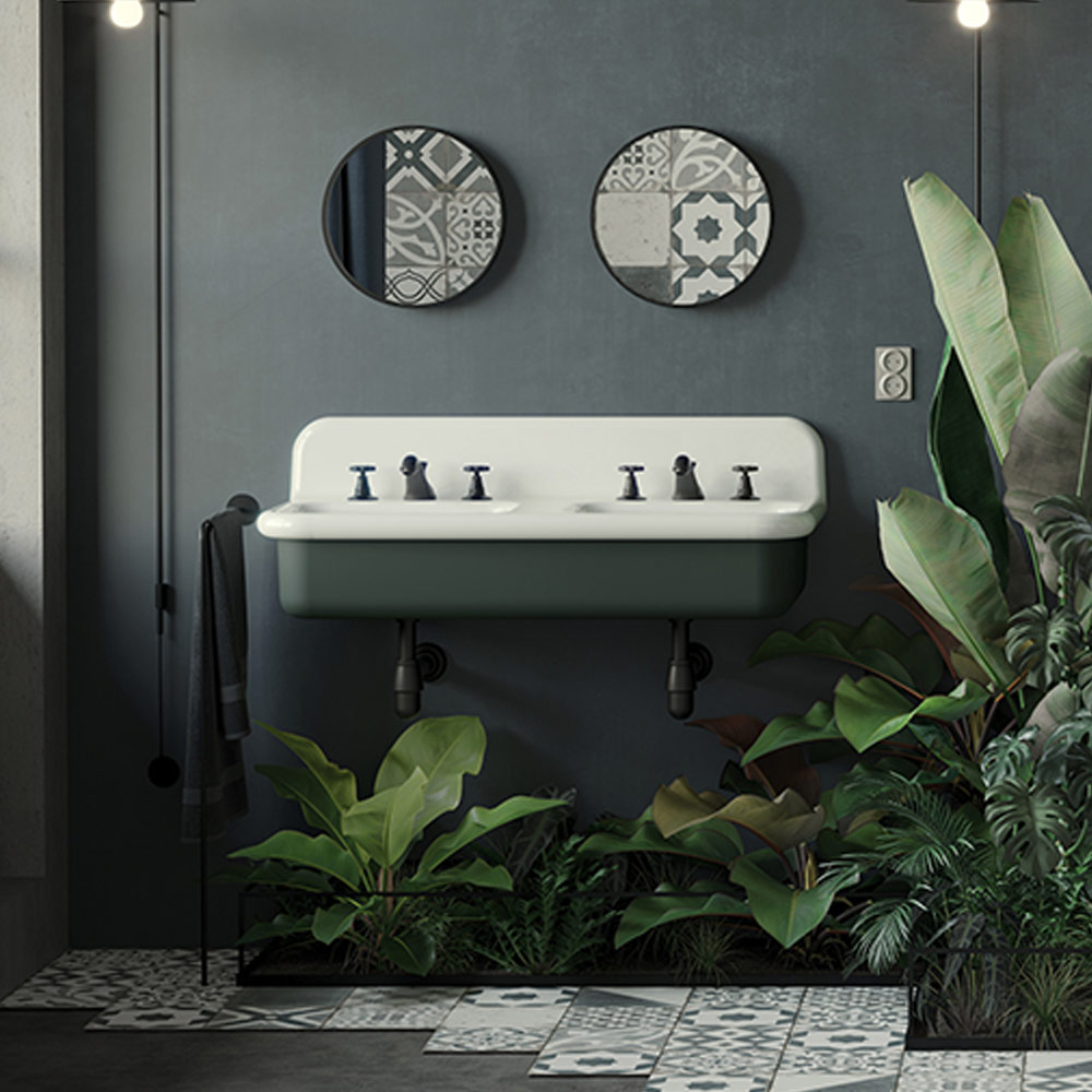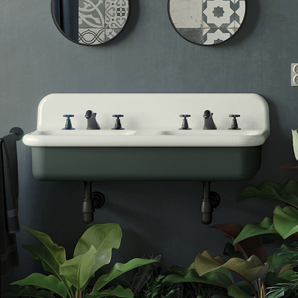 Lavabo de baño doble con estructura rectangular en cerámica bicolor blanco mate y verde bosque.