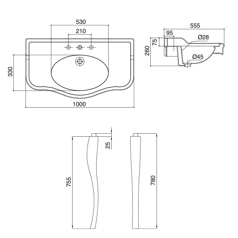 - Encimera: A 100 x P 55,5 x H 26 cm con lavabo individual; patas: H 78 cm con salpicadero y borde de salpicadero 1-3 agujeros para grifo - L 1000 mm;