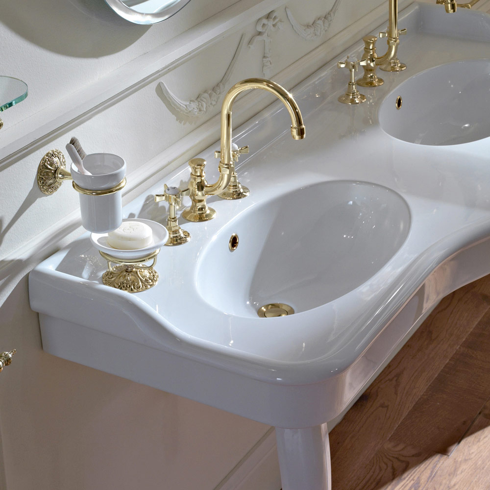 Consola de baño vintage con lavabo doble de cerámica blanca Paulina, fabricada en Italia.