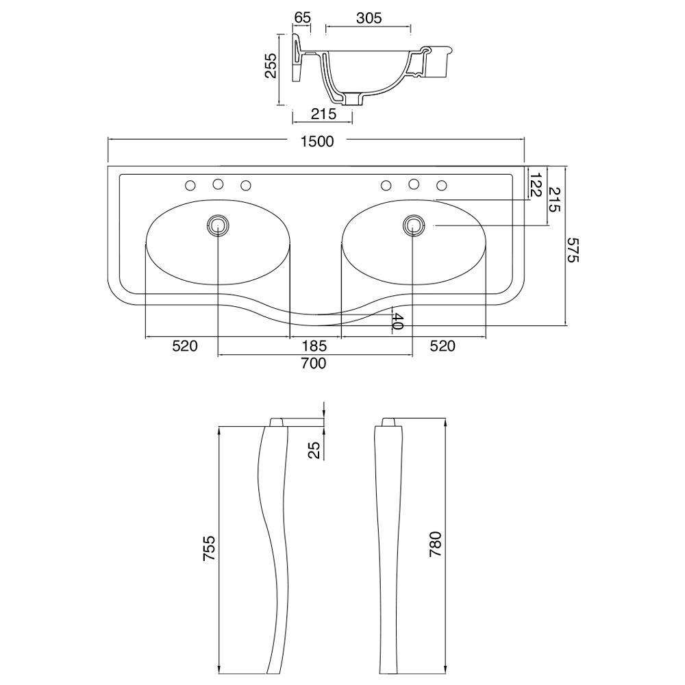 - Encimera: A 150 x P 57,5 x Alt 25,5 cm con lavabo doble; patas: Alt 78 cm con salpicadero 1-3 agujeros de grifo para lavabo - L 1500 mm;