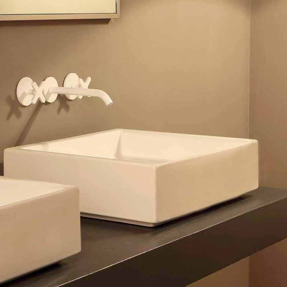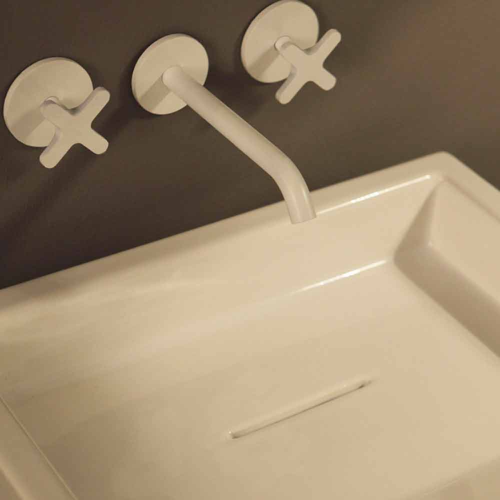 Lavabo sobre encimera de cerámica rectangular de diseño hecho en Italia Dalia Lavabo moderno de diseño rectangular inspirado en las antiguas fuentes públicas con desagüe continuo.