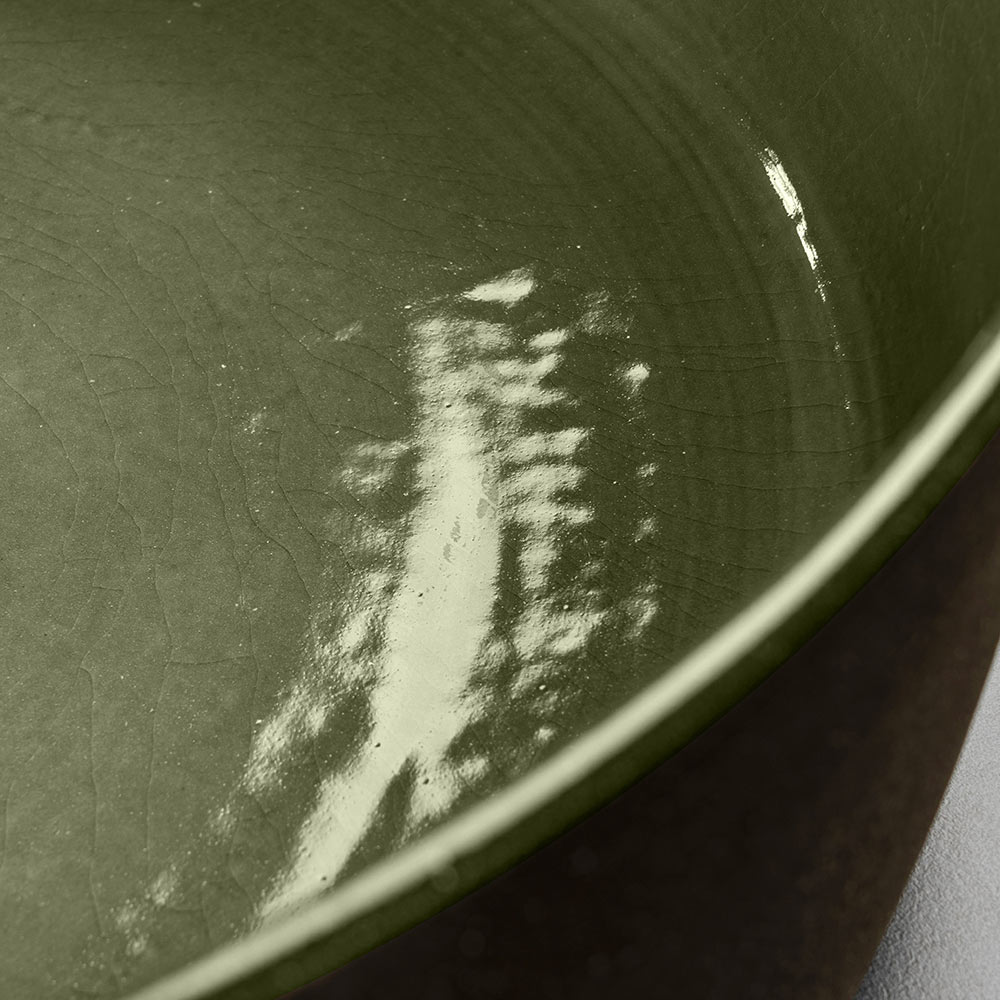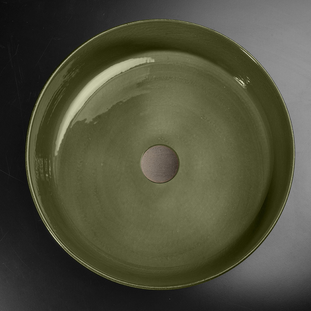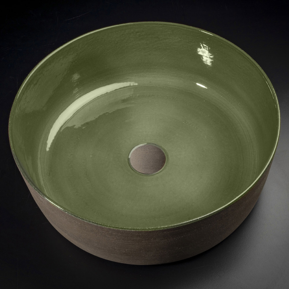 Lavabo sobre encimera de barro refractario verde torneado a mano Made in Italy.