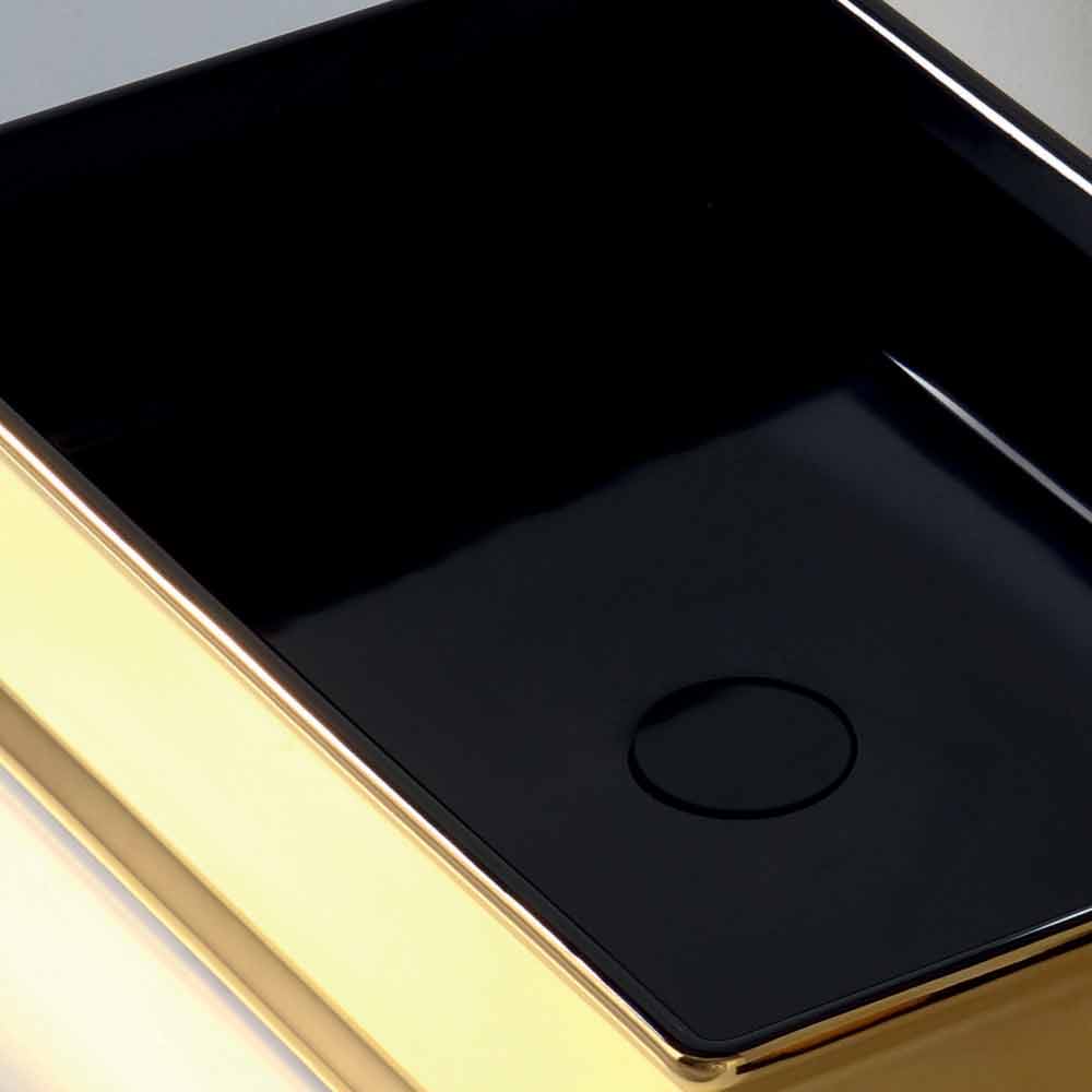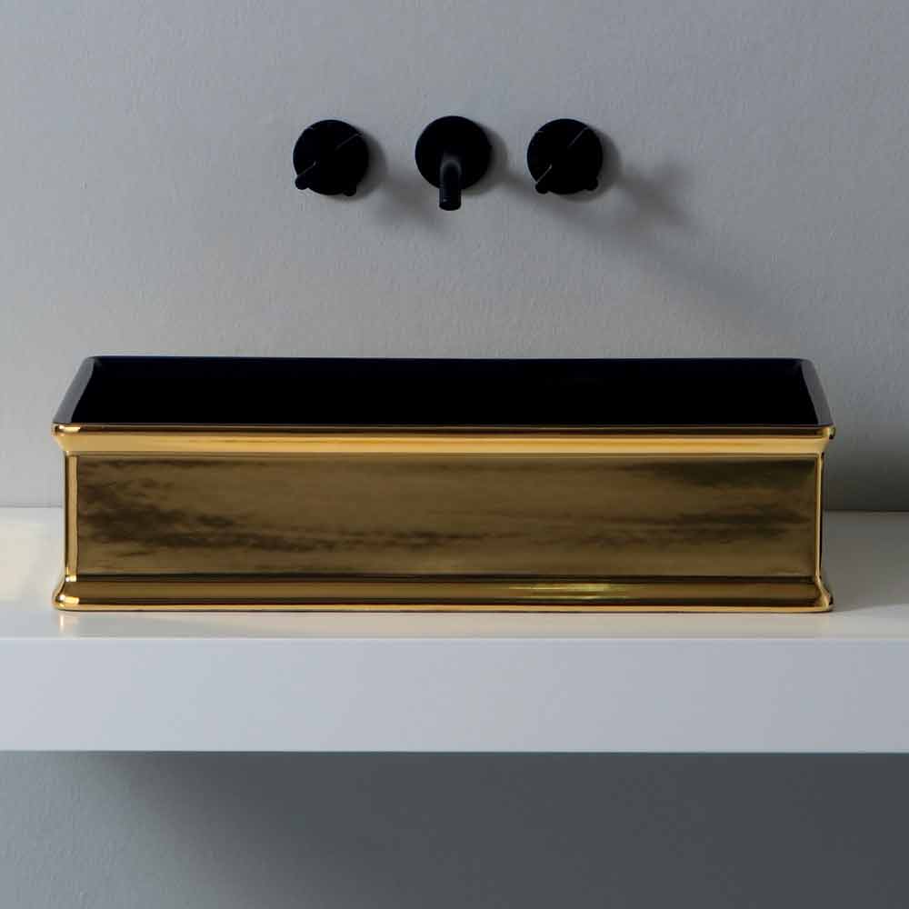 Lavabo sobre encimera en cerámica dorada / negra hecho en Italia Debora Debora es el lavabo sobre encimera hecho a mano en Italia por maestros artesanos; caracterizado por una estructura de cerámica con un acabado bicolor: dorado y negro. A pesar de los dos colores tan brillantes, contiene un refinamiento extremo y un diseño moderno perfecto para amueblar cualquier estilo de cualquier baño.