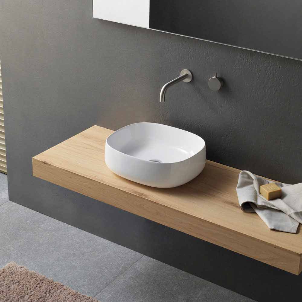 Lavabo sobre encimera de cerámica sin rebosadero y desagüe excluido. Un complemento moderno y atemporal, de líneas suaves y fácilmente adaptable a cualquier estilo contextual.