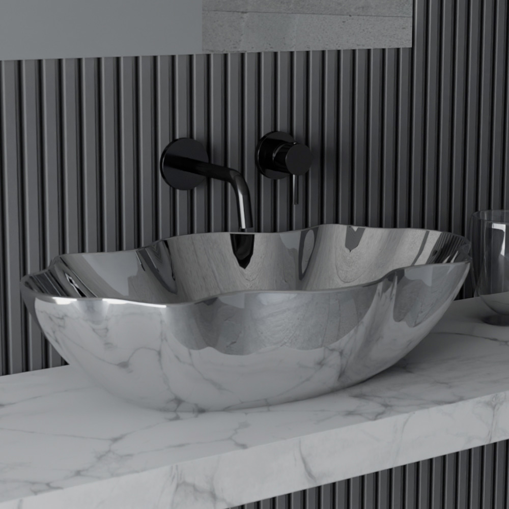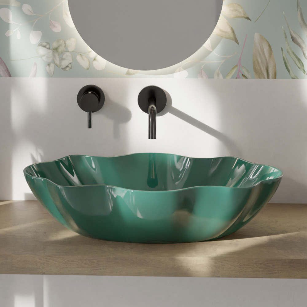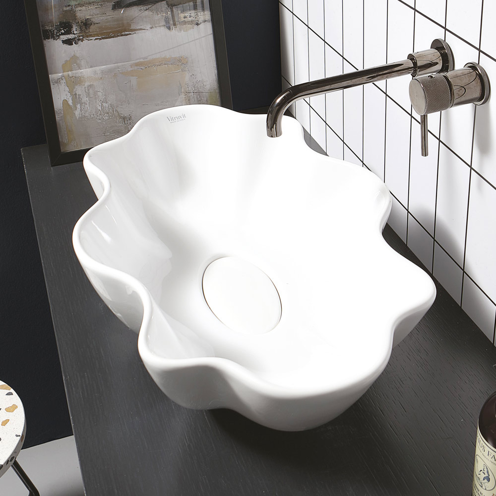 Lavabo de baño sobre encimera de cerámica, fabricado en Italia mediante producción artesanal . Un complemento de decoración para la zona del baño caracterizado por un estilo original y cautivador cuya idea surge del deseo de proponer soluciones de decoración alejadas de los productos clásicos de producción en serie. El resultado es un lavabo con una estética exclusiva que llama la atención gracias a su imponente personalidad moderna y la particular forma que recuerda a la de una concha.