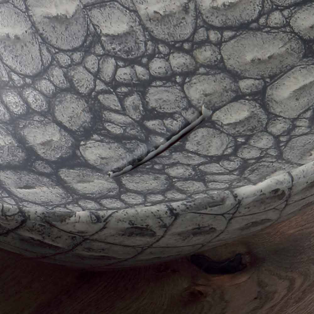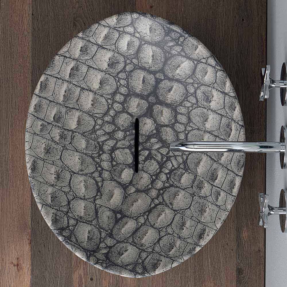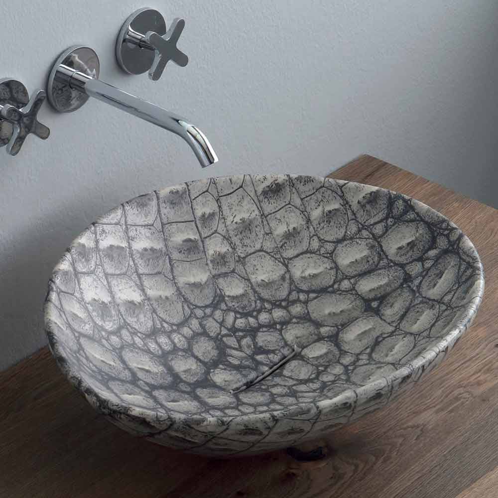 Lavabo de cerámica de diseño sobre encimera de coco hecho en Italia Animales Animals es un lavabo de encimera de cerámica de forma irregular con desagüe de flujo de agua continuo. Su acabado recuerda la piel del caimán.