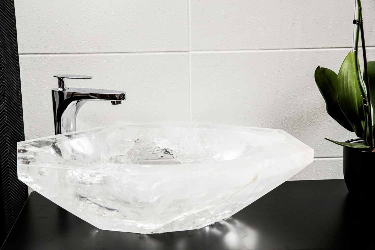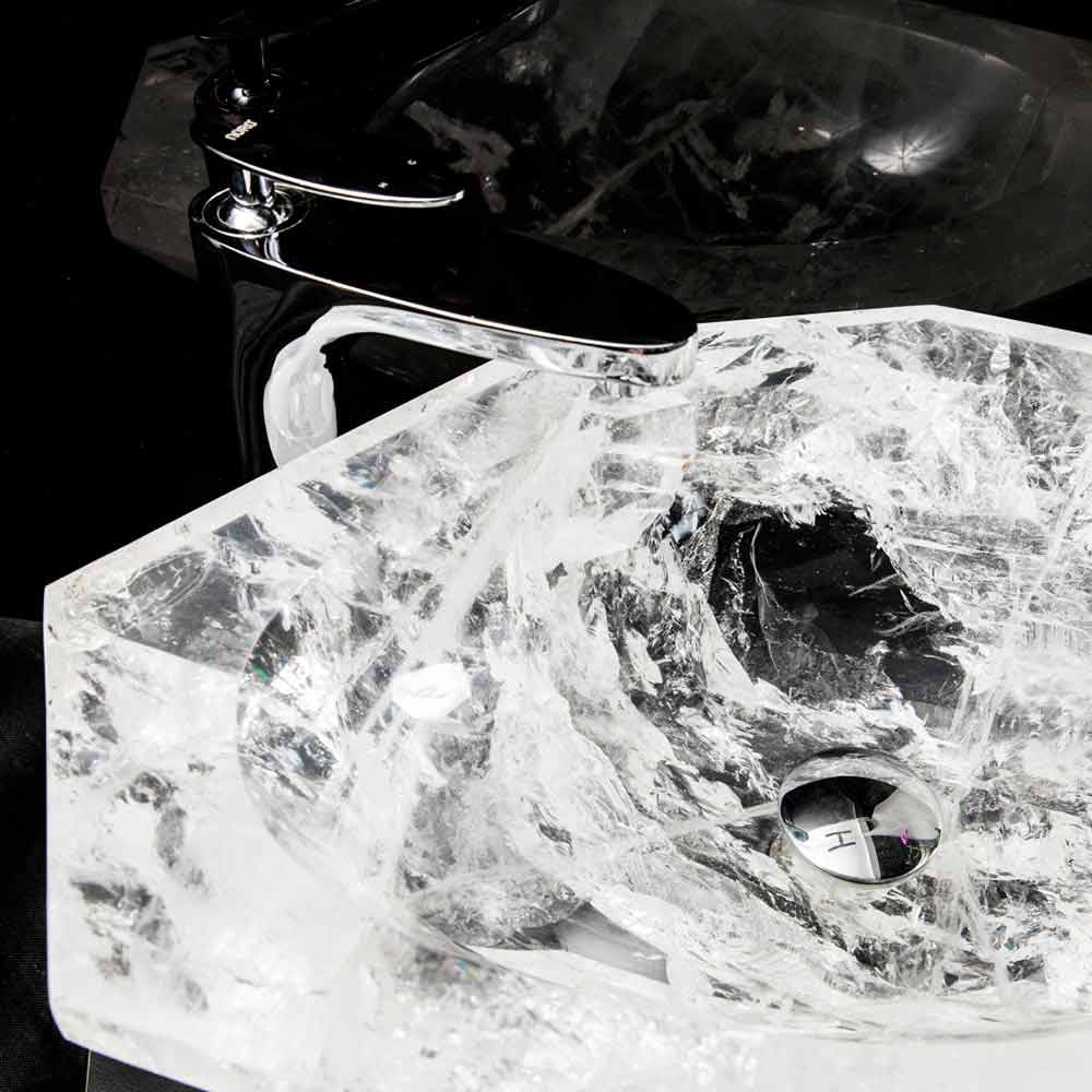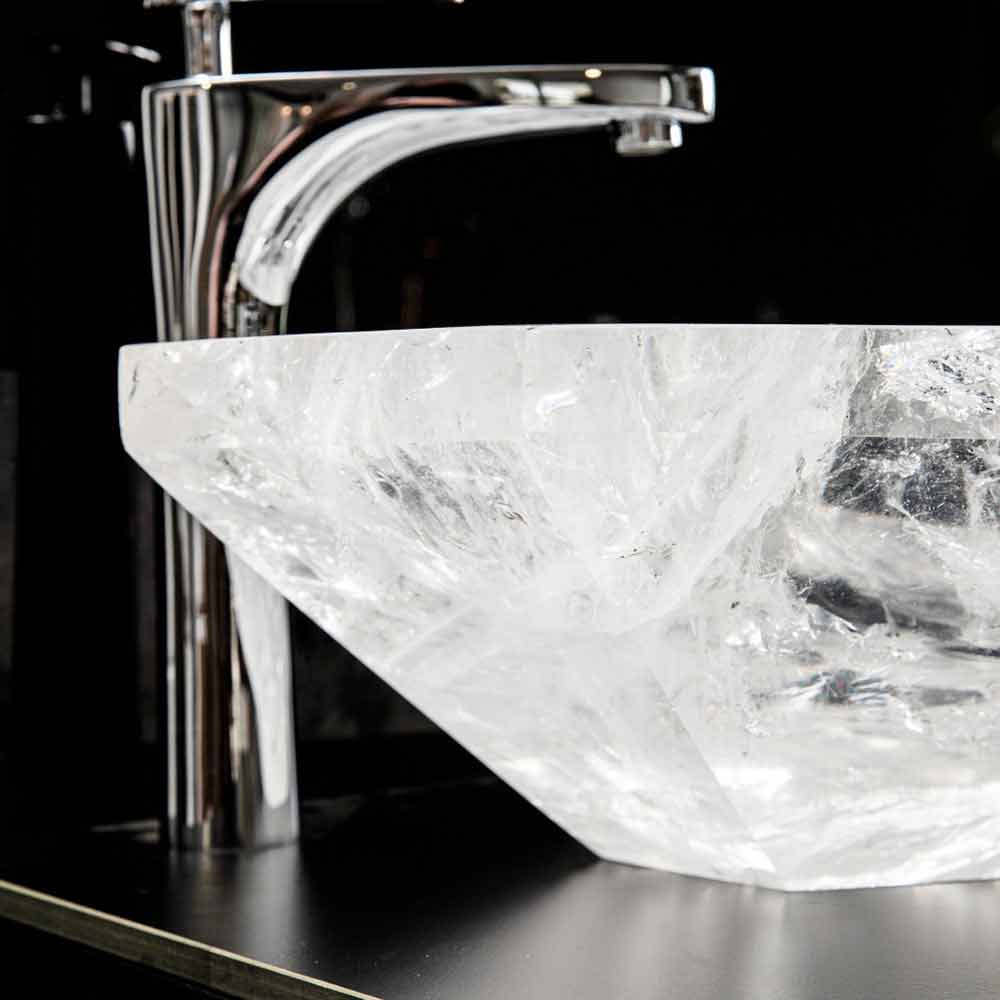 Lavabo sobre encimera de diseño hecho a mano en cristal de roca, para una decoración de baño con estilo.