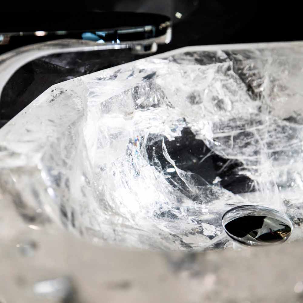 Falvaterra es un fabuloso y original lavabo hecho a mano de una sola pieza de cristal de roca. El acabado es transparente.