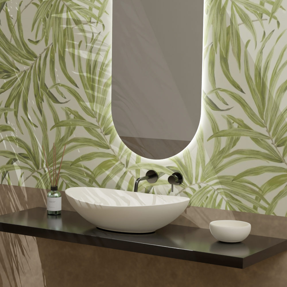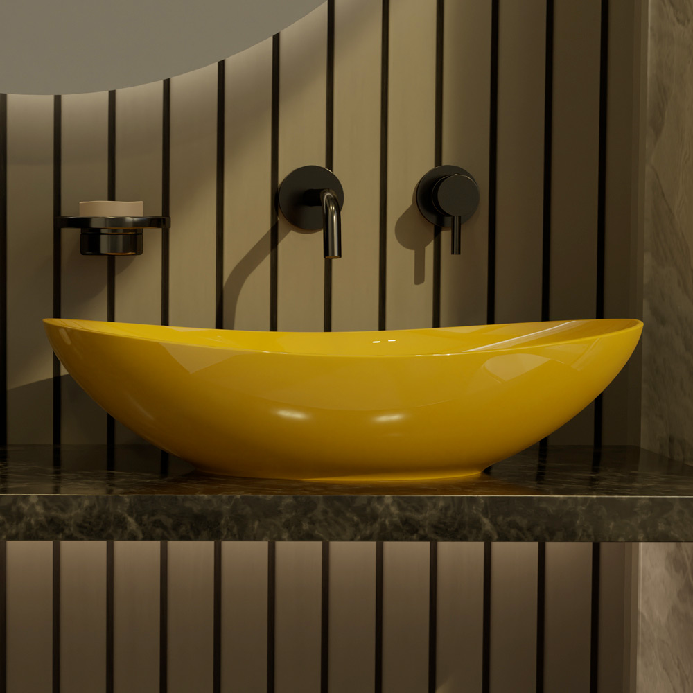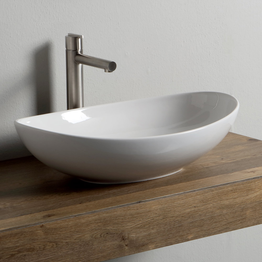 Lavabo sobre encimera ovalado en cerámica de color brillante o mate fabricado en Italia de forma artesanal . Las líneas sinuosas y armoniosas dan vida a un diseño moderno y vanguardista pensado para quienes aman un estilo sencillo y versátil sin renunciar a un toque original en su zona de baño.