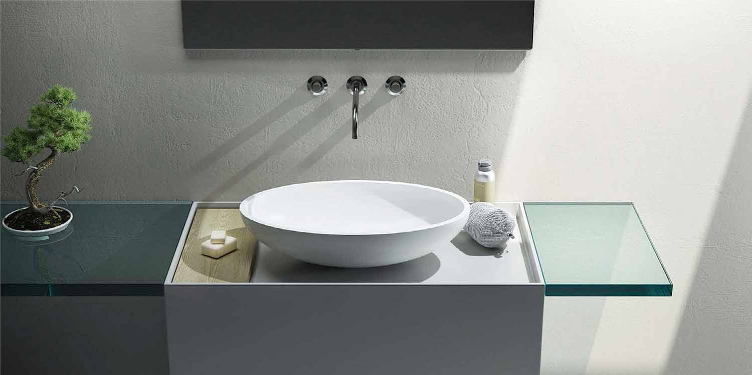 Lavabo sobre encimera óvalo en Solid Surface, Frascati Frascati es un lavabo independiente hecho de Solid Surface con una planta ovalada. Gracias a su gran capacidad y su diseño ultramoderno, es el lavabo para baño más buscado.