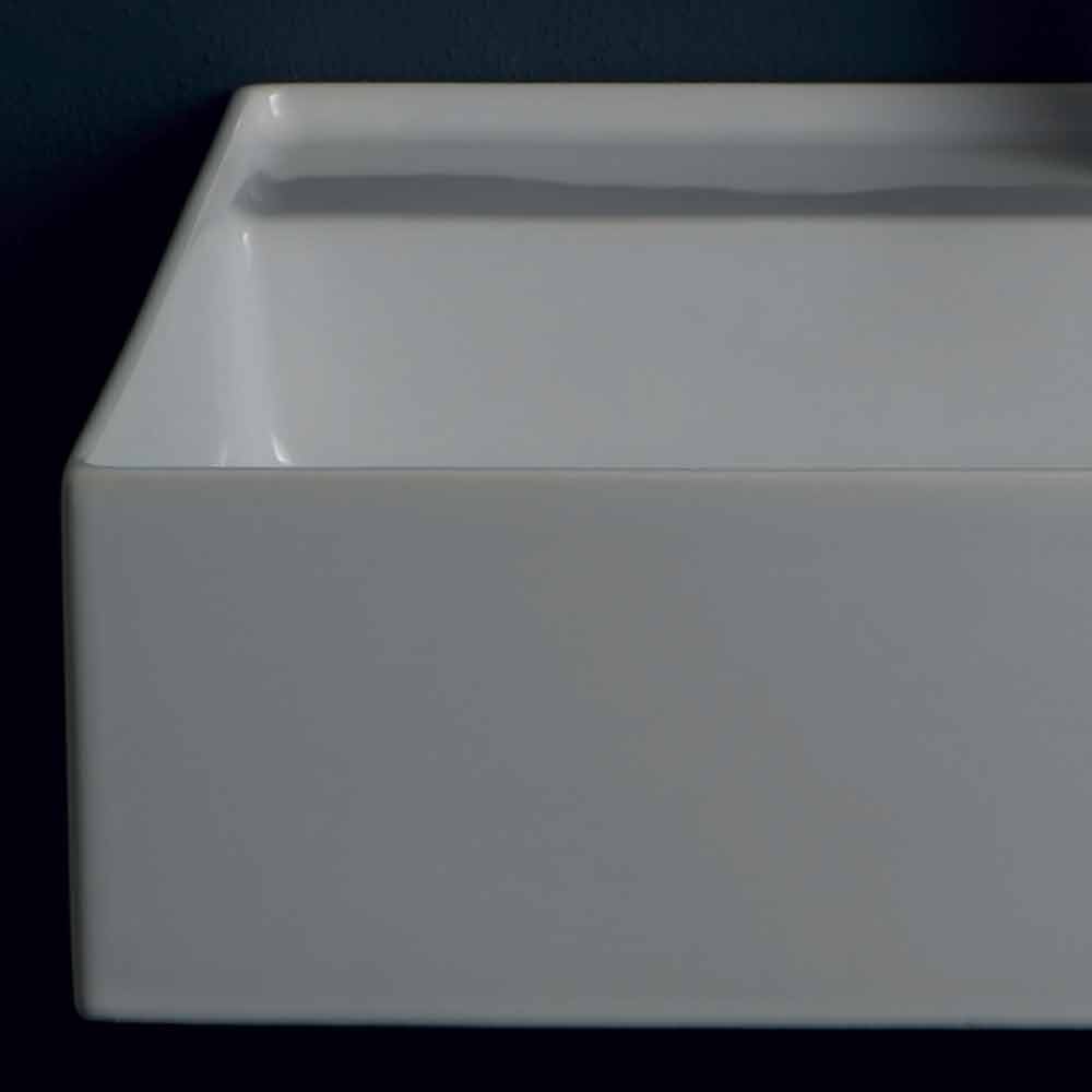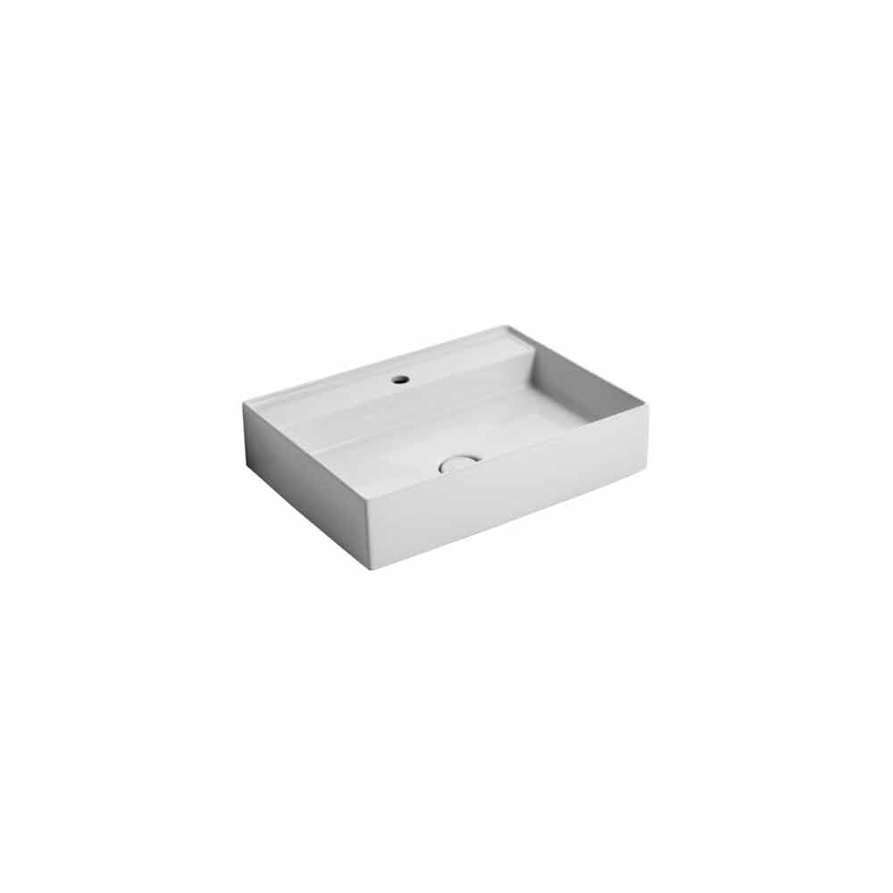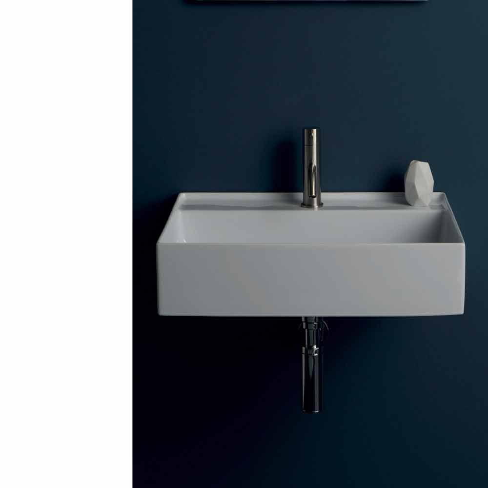 Lavabo suspendido de cerámica de diseño moderno Sun 60x45 cm, hecho en Italia La colección Ceramic in the Sun alcanza espesores muy finos para crear formas puras y elegantes. Los sanitarios de la línea Sun presentan una solución técnica innovadora para optimizar la limpieza y garantizar una mayor higiene y facilidad de uso. NÓTESE BIEN:Desagüe de cerámica de descarga libre incluido, grifo excluido. Como opción es posible disponer del sifón redondo de latón con acabado cromado.