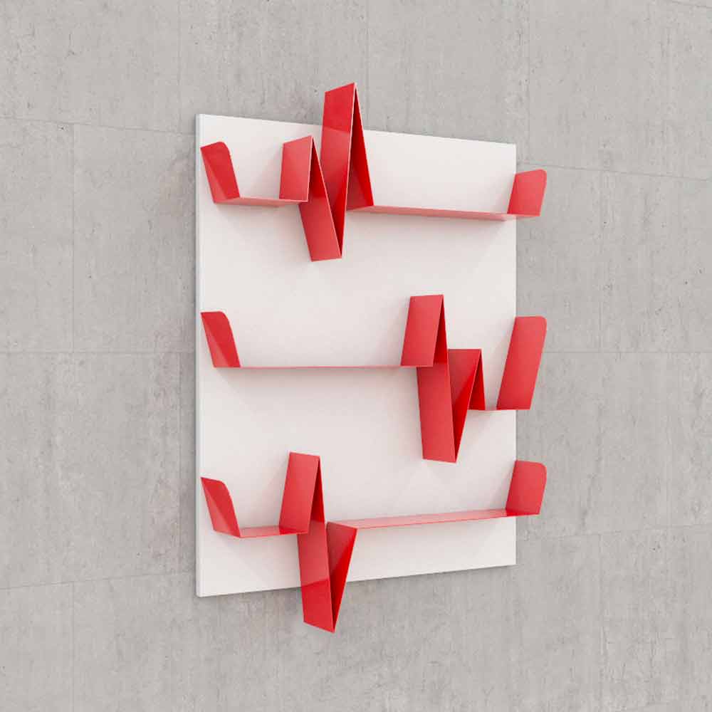 El latido del corazón y su ruta se convierte en la parte superior de este hierro de la pared pintada biblioteca original, ideal para almacenar libros o piezas favoritas. Battikuore es un complemento que suministra los ambientes y al mismo tiempo es altamente funcional, gracias a la forma dinámica de la pista que, además de actuar como un estante, también sirve como un sujetalibros práctico. Diseño: Giorgio Giorgis