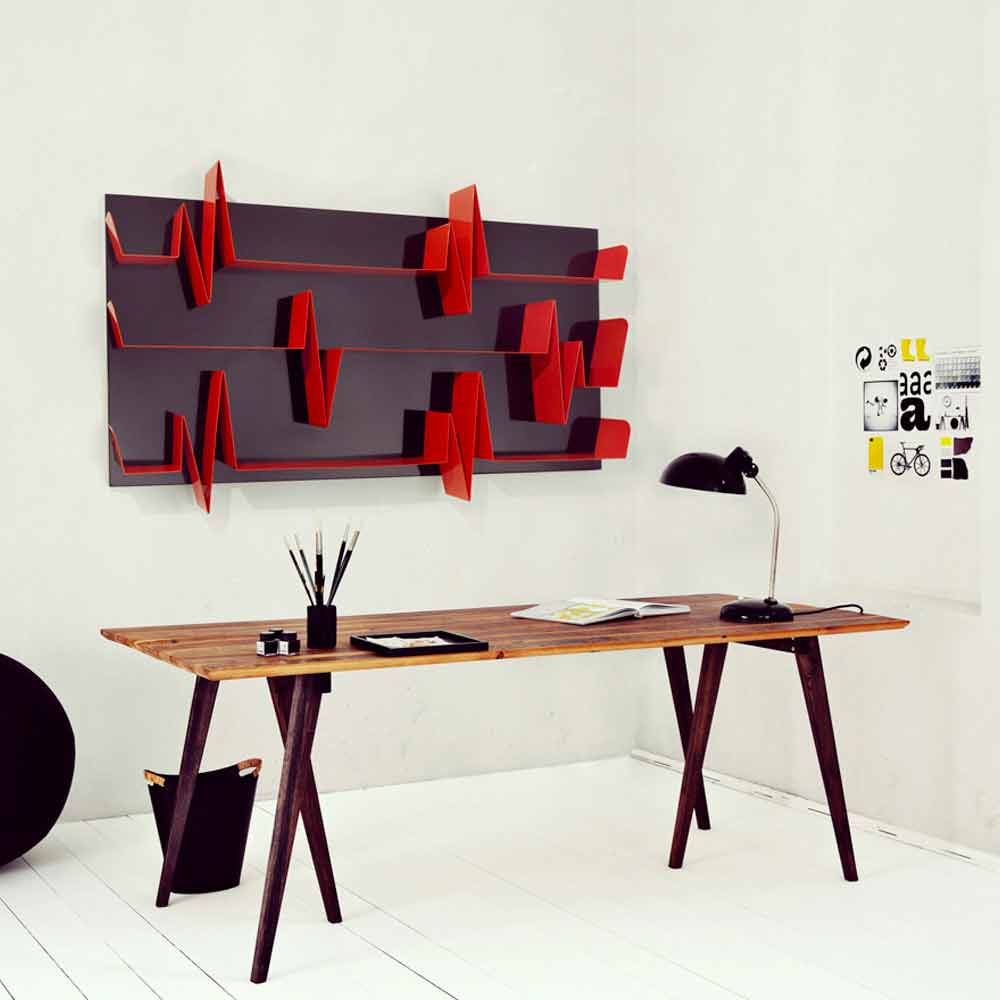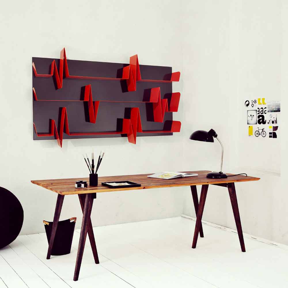 El latido del corazón y su ruta se convierte en la parte superior de este hierro de la pared pintada biblioteca original, ideal para almacenar libros o piezas favoritas. Battikuore es un complemento que suministra los ambientes y al mismo tiempo es altamente funcional, gracias a la forma dinámica de la pista que, además de actuar como un estante, también sirve como un sujetalibros práctico. Diseño: Giorgio Giorgis