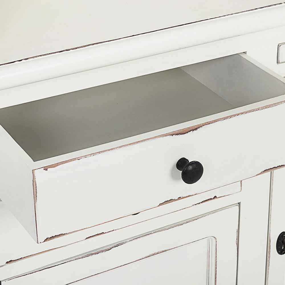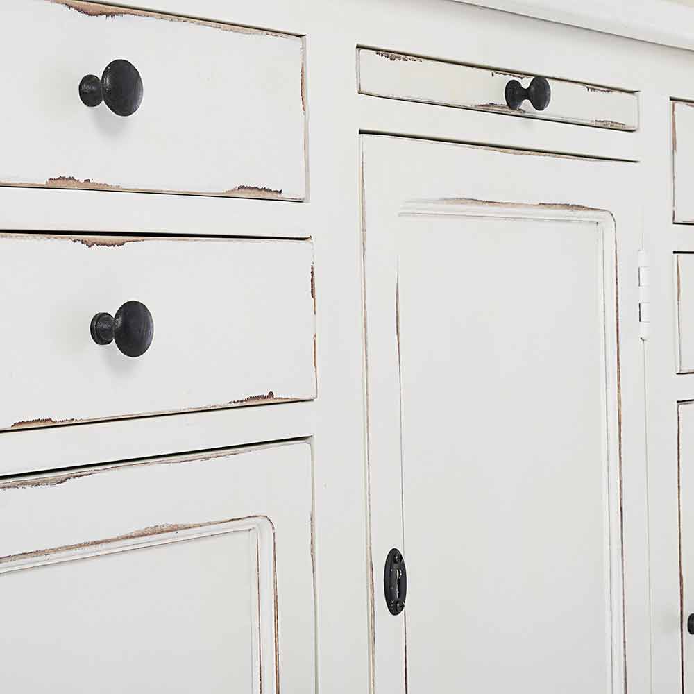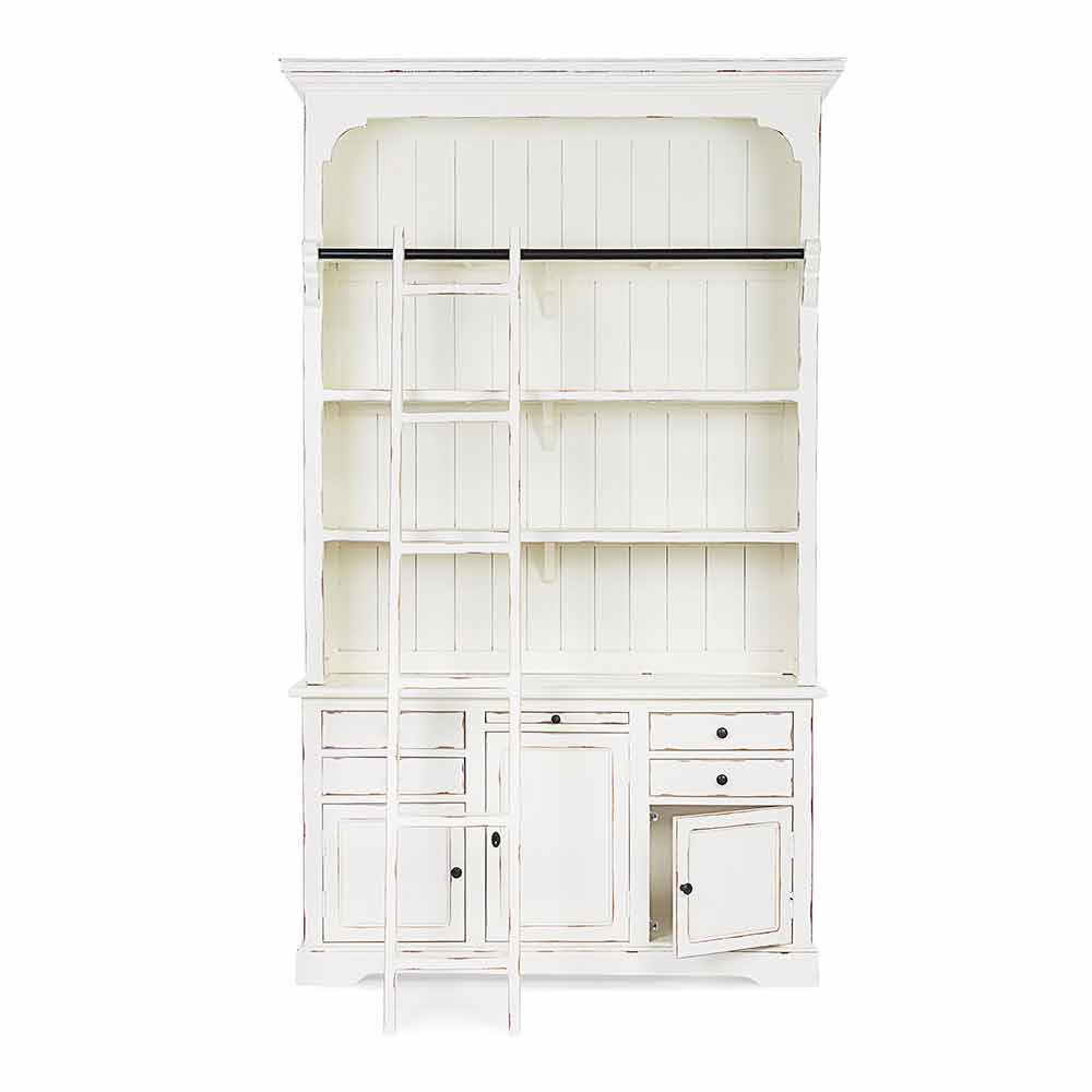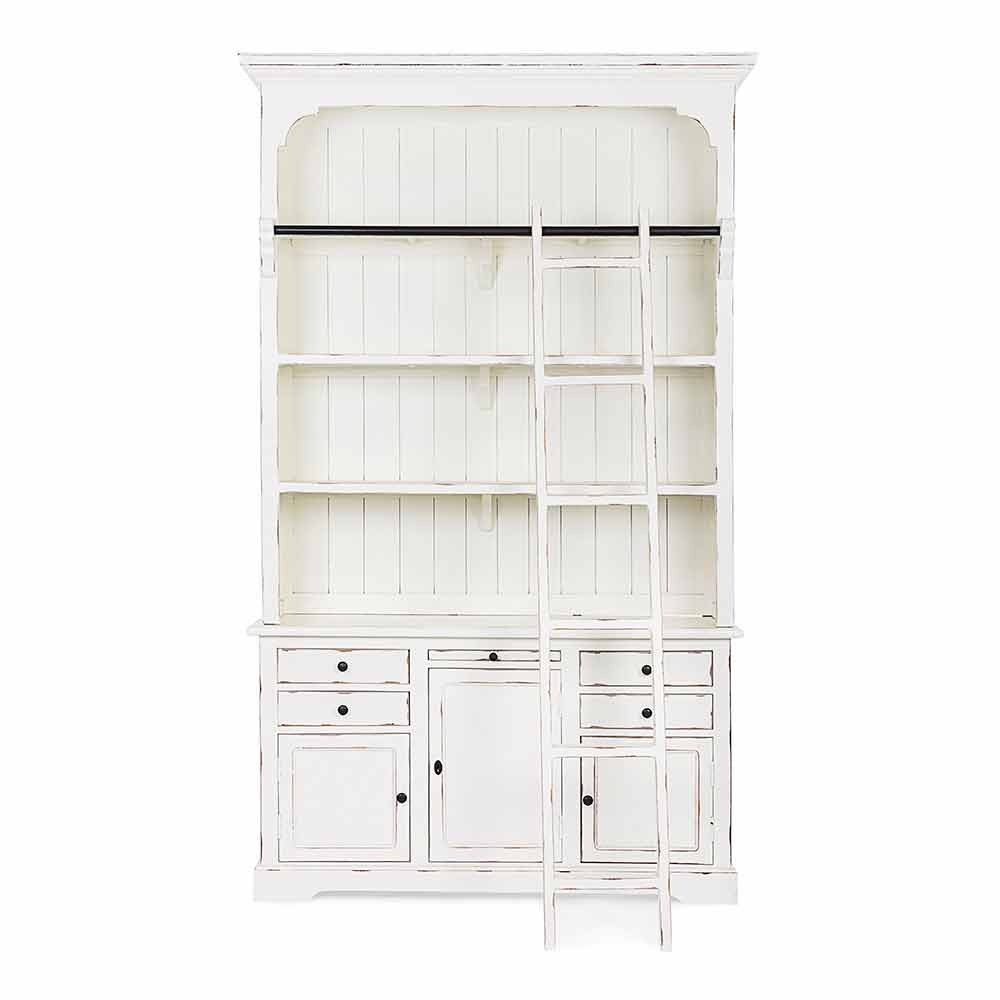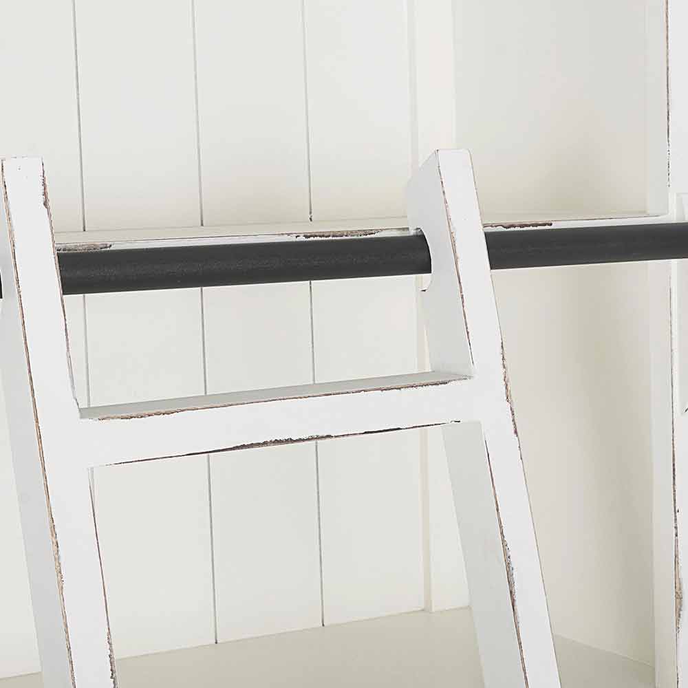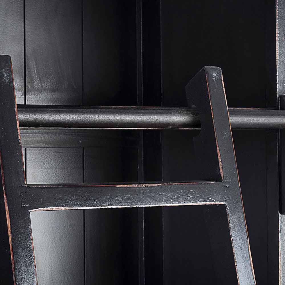 Estructura en madera de mango , fondo y aros en mdf . Escalera decorativa en madera de mango. Acabado decapado y envejecido a base de nitrocelulosa. Asas de hierro fundido . Para ser ensamblado.